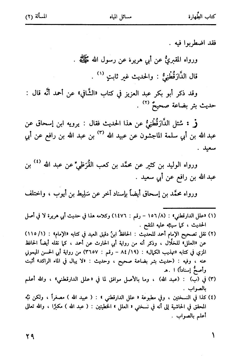 (4) كذا في النسختين، وفي مطبوعة "علل الدارقطني": (عبيد الله) مصغراً، ولكن نبَّه المحقق في الحاشية إلى أنه في نسختي "العلل" الخطيتين: (عبد الله) مكبَّرا، والله تعالى أعلم بالصواب.