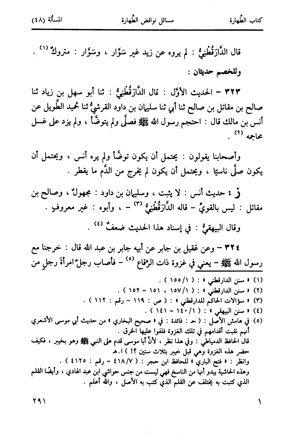 323 - الحديث الأوَل: قال الدَارَقُطني: ثنا أبو سهل بن زياد ثنا صالح بن مقاتل بن صالح ثنا أبي ثنا سليمان بن داود القرشي ثنا حُميد الطَّويل عن أنس بن مالك قال: احتجم رسول الله صَلَّى اللَّهُ عَلَيْهِ وَسَلَّمَ فصلَّى ولم يتوضَّأ، ولم يزد على غسل محاجمه (2).