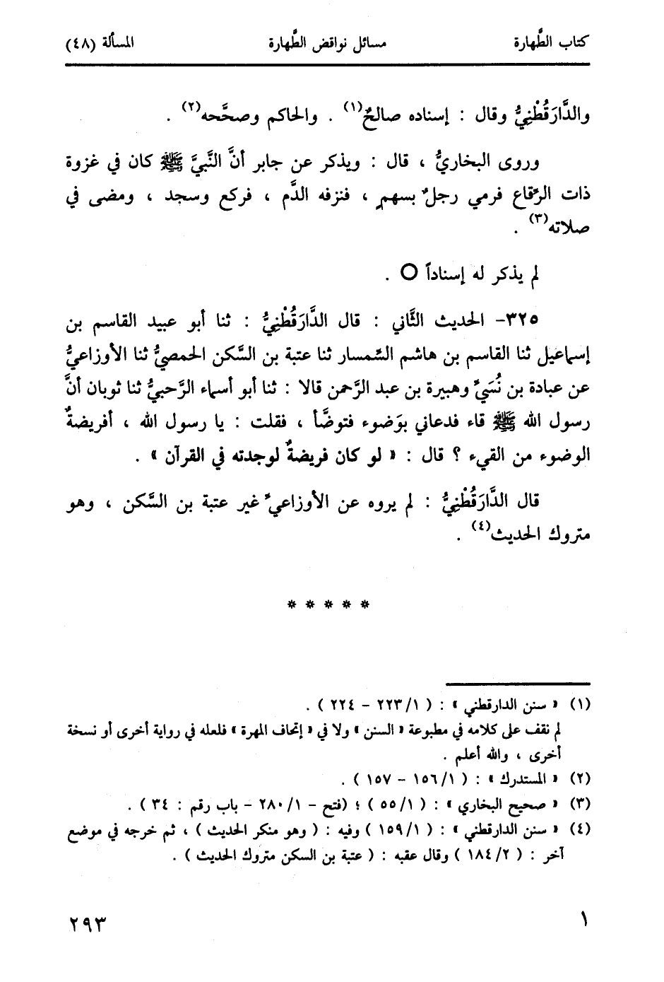 (4) "سنن الدارقطني": (1/ 159) وفيه: (وهو منكر الحديث)، ثم خرجه في موضع آخر: (2/ 184) وقال عقبه: (عتبة بن السكن متروك الحديث).