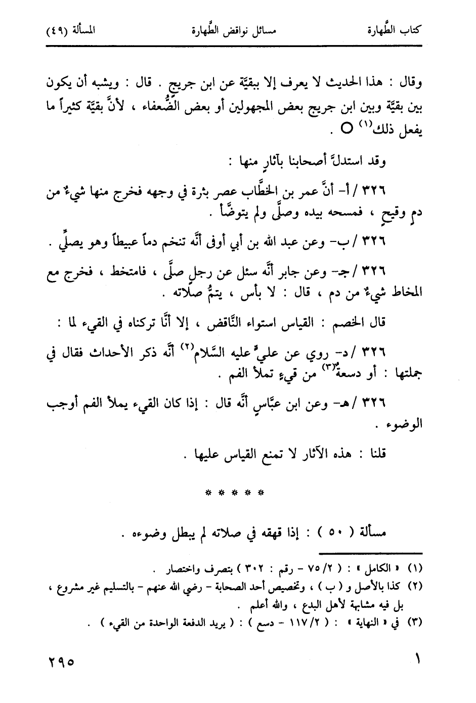 قال الخصم: القياس استواء النَّاقض، إلا أنَّا تركناه في القيء لما: 326/د- روي عن علي عليه السَّلام (2) أنَّه ذكر الأحداث فقال في جملتها: أو دسعةٌ (3) من قيءَ تملأ الفم.