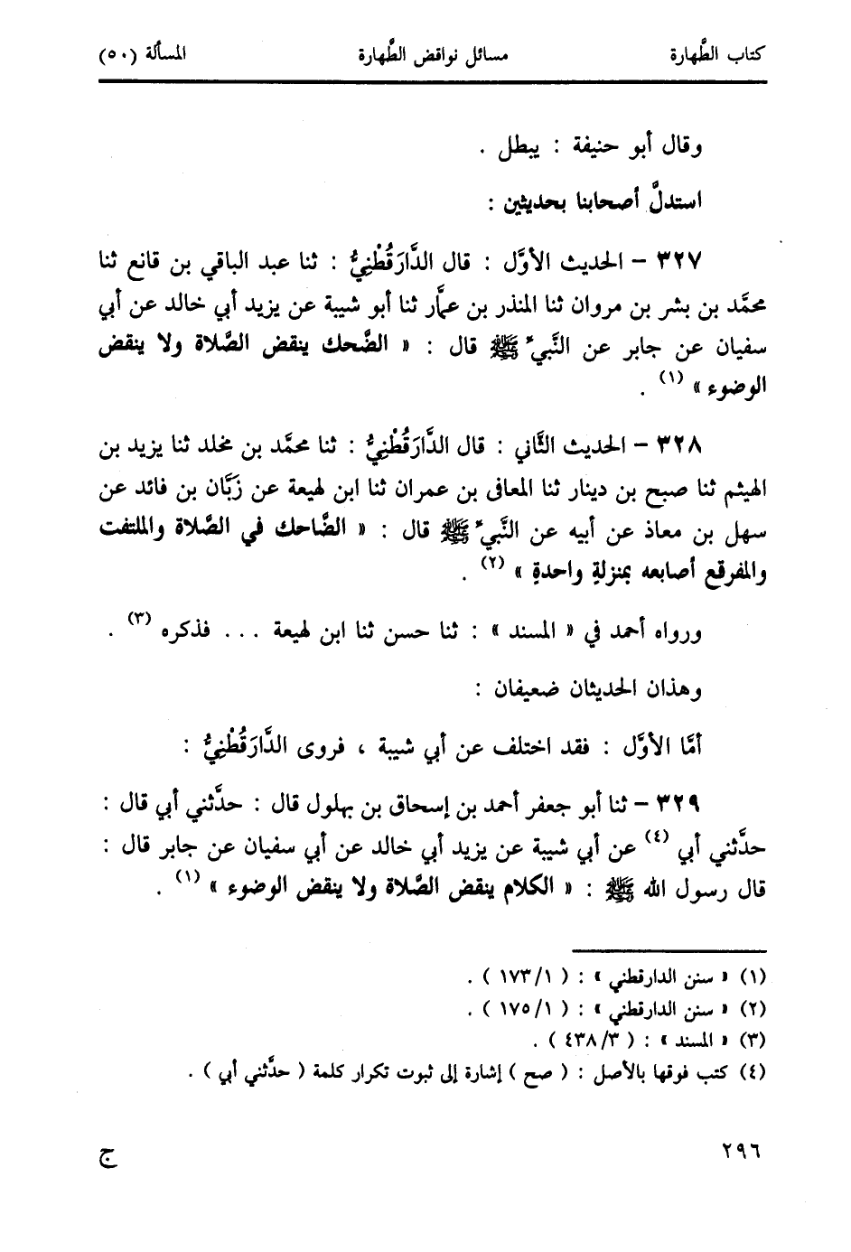 327 - الحديث الأوَل: قال الدَّارَقُطني: ثنا عبد الباقي بن قانع ثنا محمَّد بن بشر بن مروان ثنا المنذر بن عمَّار ثنا أبو شيبة عن يزيد أبي خالد عن أبي سفيان عن جابر عن النبيٌ صَلَّى اللَّهُ عَلَيْهِ وَسَلَّمَ قال: " الضَّحك ينقض الصَّلاة ولا ينقض الوضوء" (1).