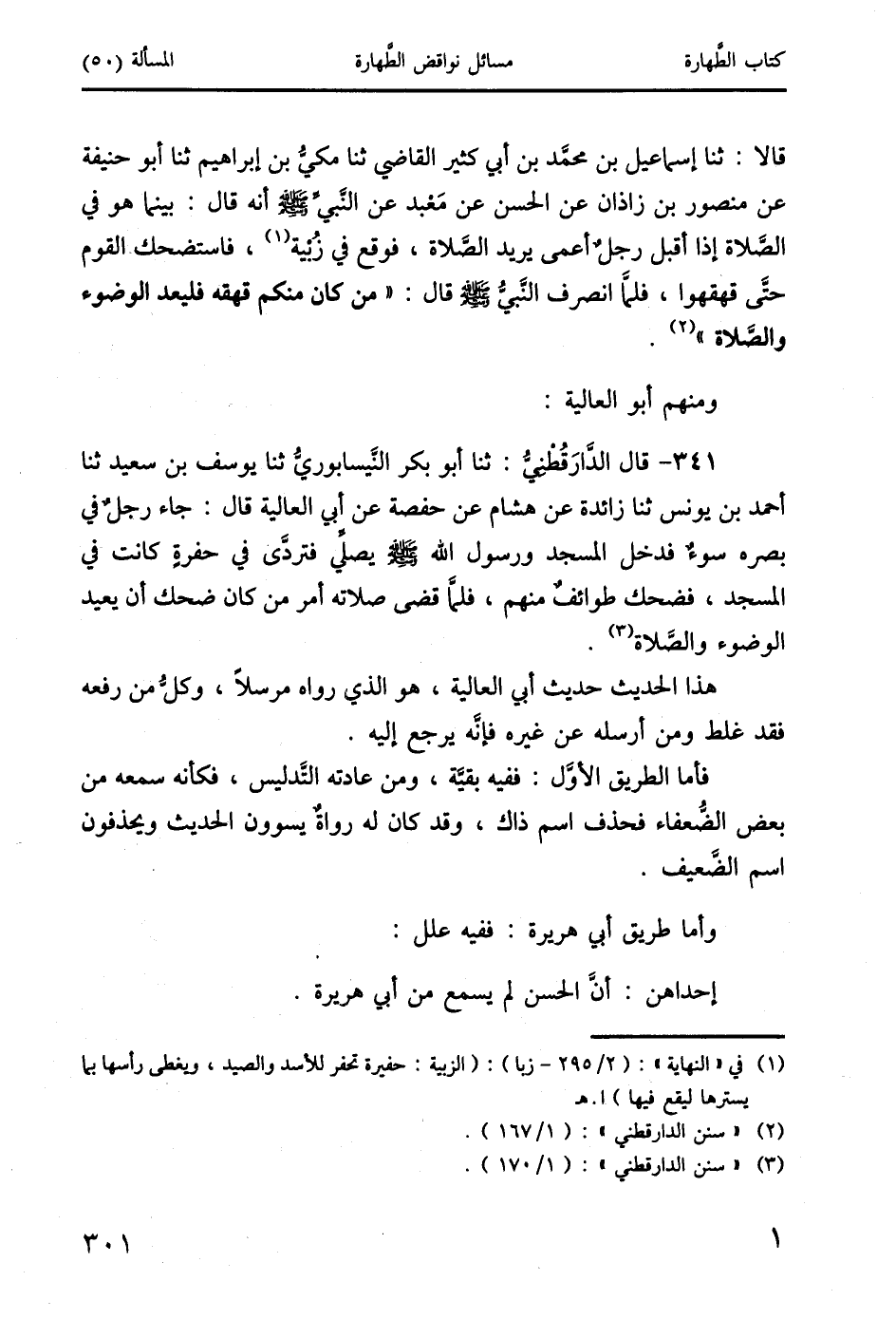 341 - قال الدَارَقُطَّنيُ: ثنا أبو بكر النَّيسابوريُّ ثنا يوسف بن سعيد ثنا أحمد بن يونس ثنا زائدة عن هشام عن حفصة عن أبي العالية قال: جاء رجلٌ في بصره سوءٌ فدخل المسجد ورسول الله صَلَّى اللَّهُ عَلَيْهِ وَسَلَّمَ يصلي فتردَّى في حفرةٍ كانت في المسجد، فضحك طوائفٌ منهم، فلمَّا قضى صلاته أمر من كان ضحك أن يعيد الوضوء والصَلاة (3).