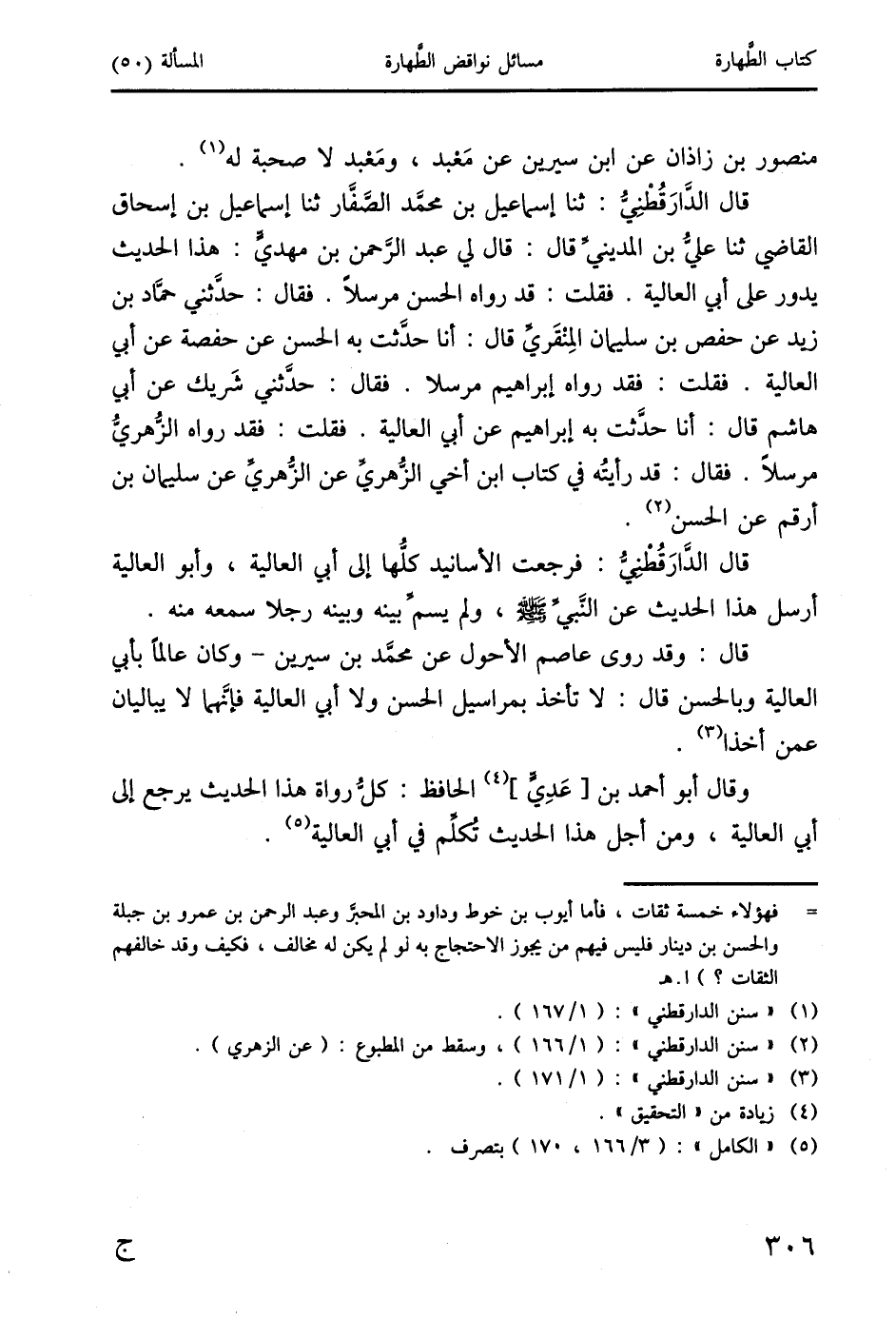 قال الدَارَقُطْنِيُ: ثنا إسماعيل بن محمَّد الصَفَار ثنا إسماعيل بن إسحاق القاضي ثنا عليُ بن المدينيِّ قال: قال لي عبد الرَحمن بن مهديّ: هذا الحديث يدور على أبي العالية. فقلت: قد رواه الحسن مرسلاً. فقال: حدَثني حمَّاد بن زيد عن حفص بن سليمان المِنْقَري قال: أنا حدَثت به الحسن عن حفصة عن أبي العالية. فقلت: فقد رواه إبراهيم مرسلا. فقال: حدَثني شَريك عن أبي هاشم قال: أنا حدَّثت به إبراهيم عن أبي العالية. فقلت: فقد رواه الزهريَّ مرسلاً. فقال: قد رأيتُه في كتاب ابن أخي الزهري عن الزهري عن سليمان بن أرقم عن الحسن (2).
