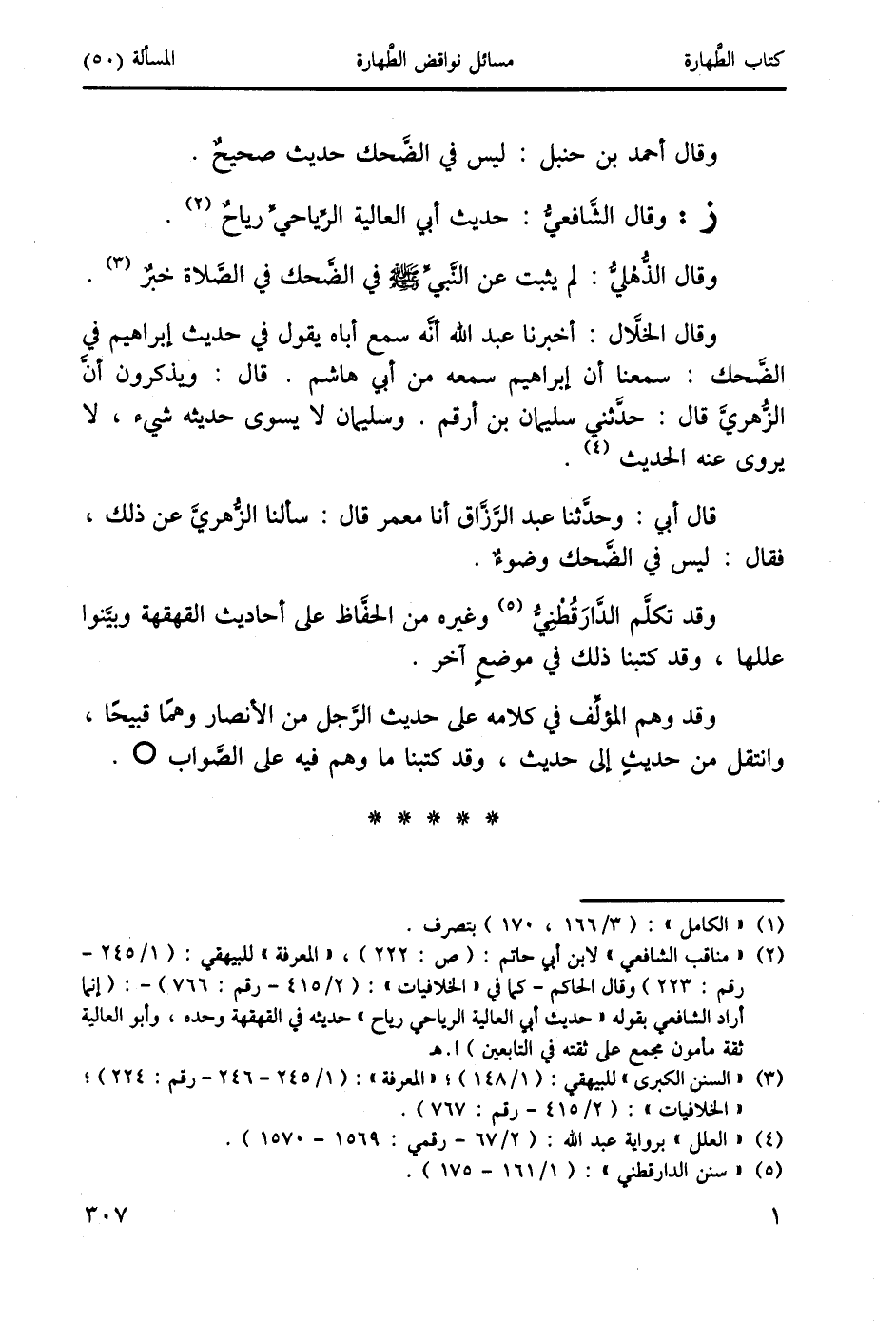 وقد تكلَم الدَّارَقُطنِي (5) وغيره من الحفَّاظ على أحاديث القهقهة وبيَنوا عللها، وقد كتبنا ذلك في موضعٍ آخر.