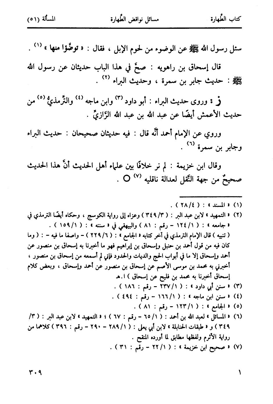 (6) "المسائل" لعبد الله بن أحمد: (1/ 65 - رقم: 67)؛ "التمهيد" لابن عبد البر: (3/ 349) و" طبقات الحنابلة " لابن أبي يعلى: (1/ 289 - 290 - رقم: 396) كلاهما من رواية الأثرم ولفظها مطابق لما أورده المنقح.