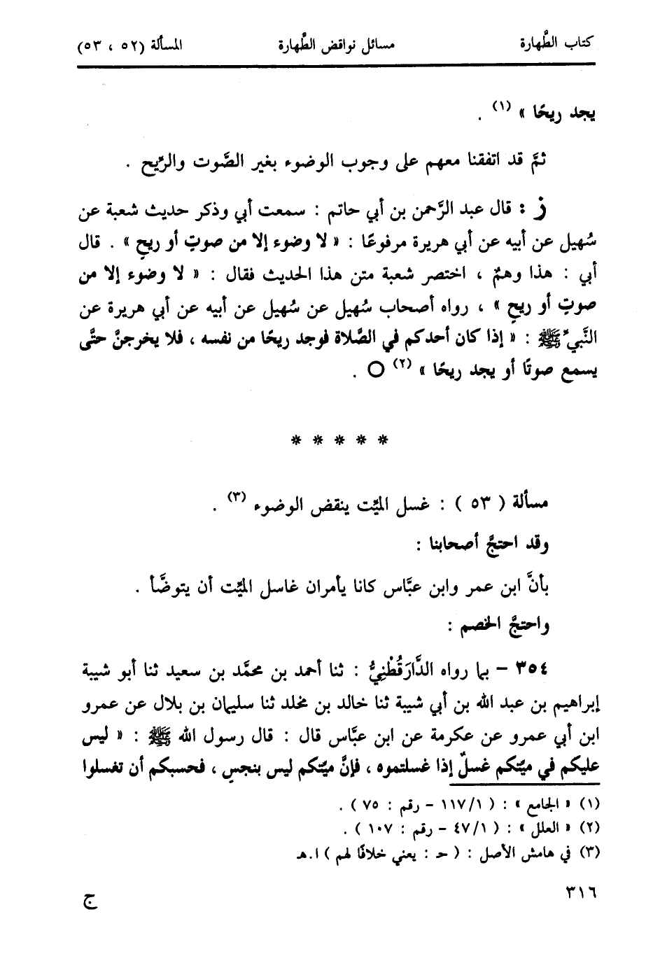 ز: قال عبد الرَّحمن بن أبي حاتم: سمعت أبي وذكر حديث شعبة عن سُهيل عن أبيه عن أبي هريرة مرفوعاً: " لا وضوء إلا من صوتٍ أو ريحٍ ". قال أبي: هذا وهمٌ، اختصر شعبة متن هذا الحديث فقال: " لا وضوء إلا من صوتٍ أو ريحٍ "، رواه أصحاب سُهيل عن سُهيل عن أبيه عن أبي هريرة عن النَبيِّ صَلَّى اللَّهُ عَلَيْهِ وَسَلَّمَ: " إذا كان أحدكم في الصلاة فوجد ريحاً من نفسه، فلا يخرجنَّ حتَّى يسمع صوتاً أو يجد ريحاً " (2) O.
