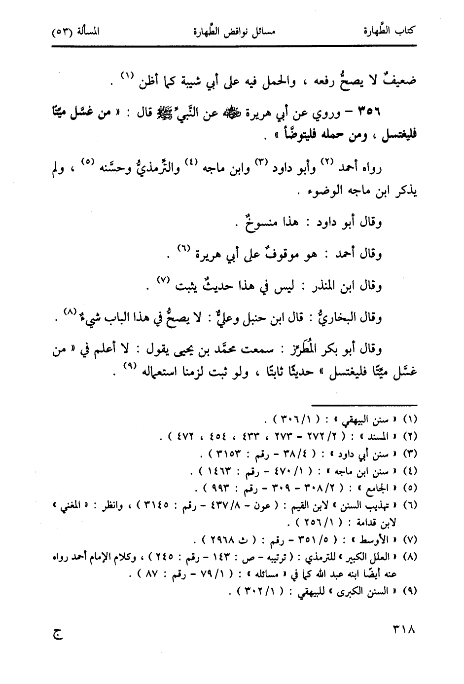 356 - وروي عن أبي هريرة رضي الله عنه عن النَبيِّ صَلَّى اللَّهُ عَلَيْهِ وَسَلَّمَ قال: "من غسَّل ميِّتاً فليغتسل، ومن حمله فليتوضأ".