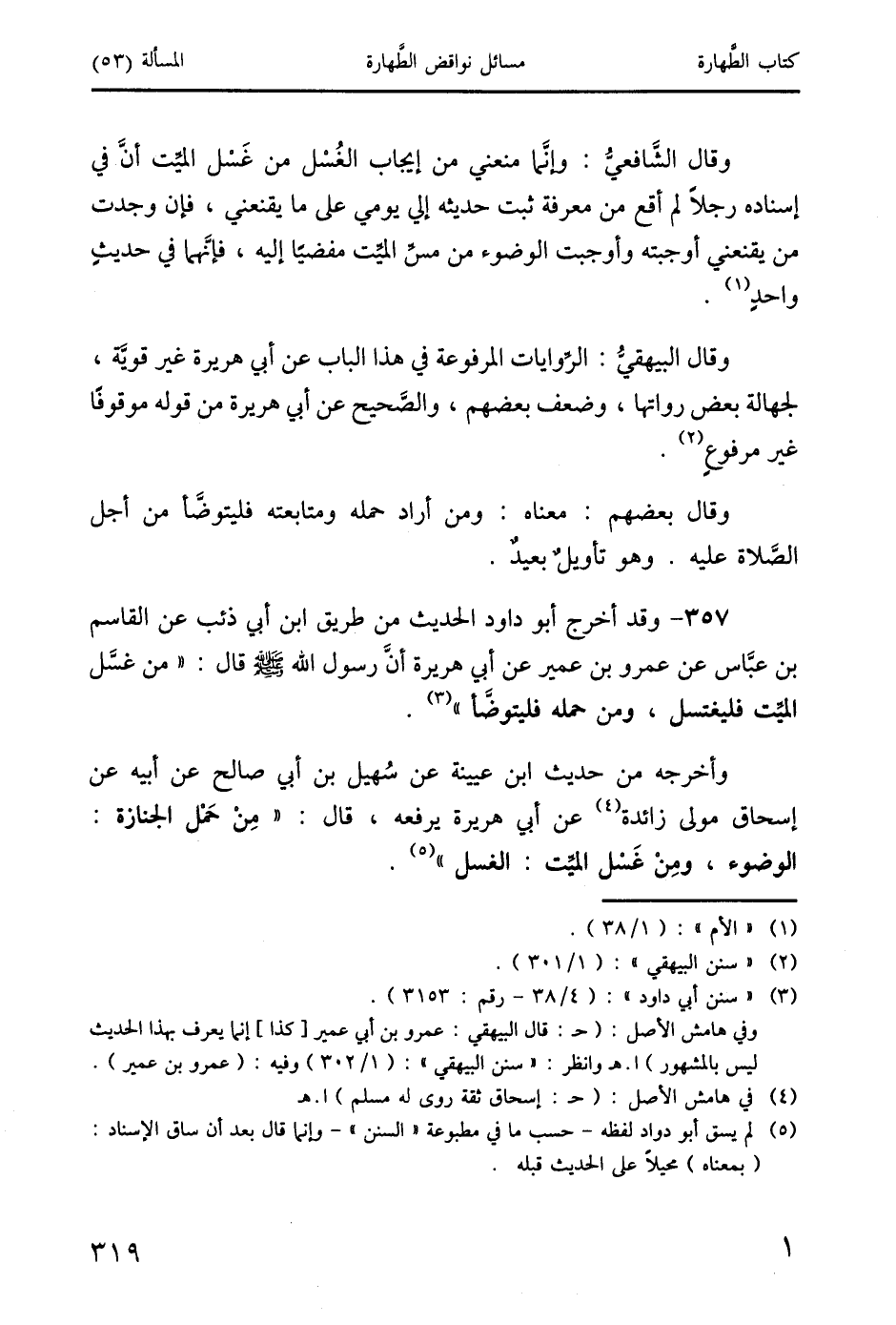 357 - وقد أخرج أبو داود الحديث من طريق ابن أبي ذئب عن القاسم بن عبَّاس عن عمرو بن عمير عن أبي هريرة أنَّ رسول الله صَلَّى اللَّهُ عَلَيْهِ وَسَلَّمَ قال: " من غسَّل الميت فليغتسل، ومن حمله فليتوضَّأ " (3).
