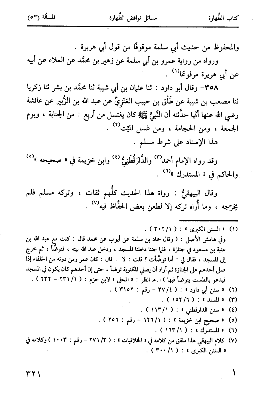 358 - وقال أبو داود: ثنا عثمان بن أبي شيبة ثنا محمَّد بن بشر ثنا زكريا ثنا مصعب بن شيبة عن طَلْق بن حبيب العَنَزِي عن عبد الله بن الزبير عن عائشة رضي الله عنها أنَّها حدَّثته أن النبيَّ صَلَّى اللَّهُ عَلَيْهِ وَسَلَّمَ كان يغتسل من أربع: من الجنابة، ويوم الجمعة، ومن الحجامة، ومن غسل الميِّت (2).