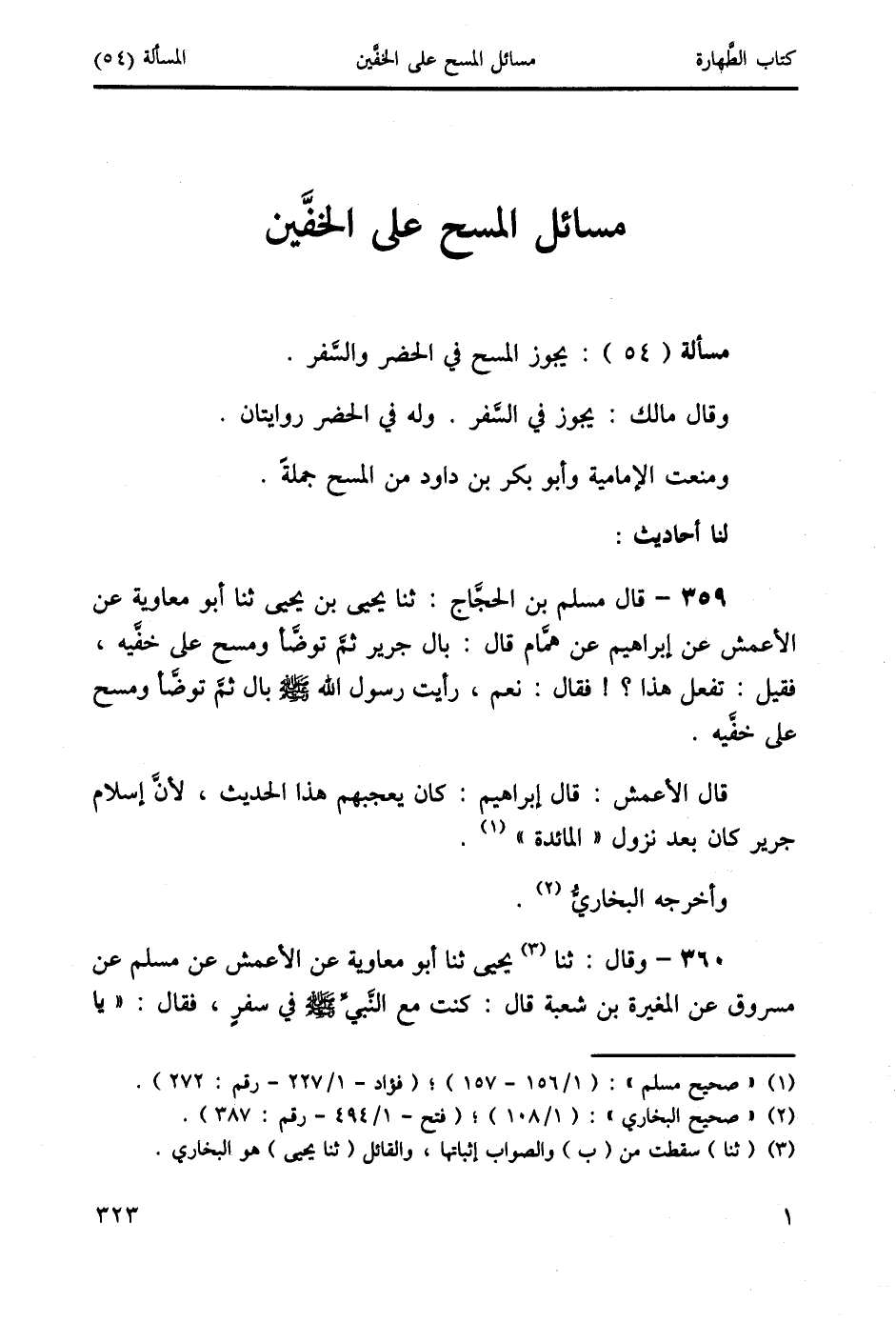359 - قال مسلم بن الحجَاج: ثنا يحيى بن يحيى ثنا أبو معاوية عن الأعمش عن إبراهيم عن همَّام قال: بال جرير ثمَّ توضَأ ومسح على خفَّيه، فقيل: تفعل هذا؟! فقال: نعم، رأيت رسول الله صَلَّى اللَّهُ عَلَيْهِ وَسَلَّمَ بال ثمَّ توضَّأ ومسح على خفَّيه.