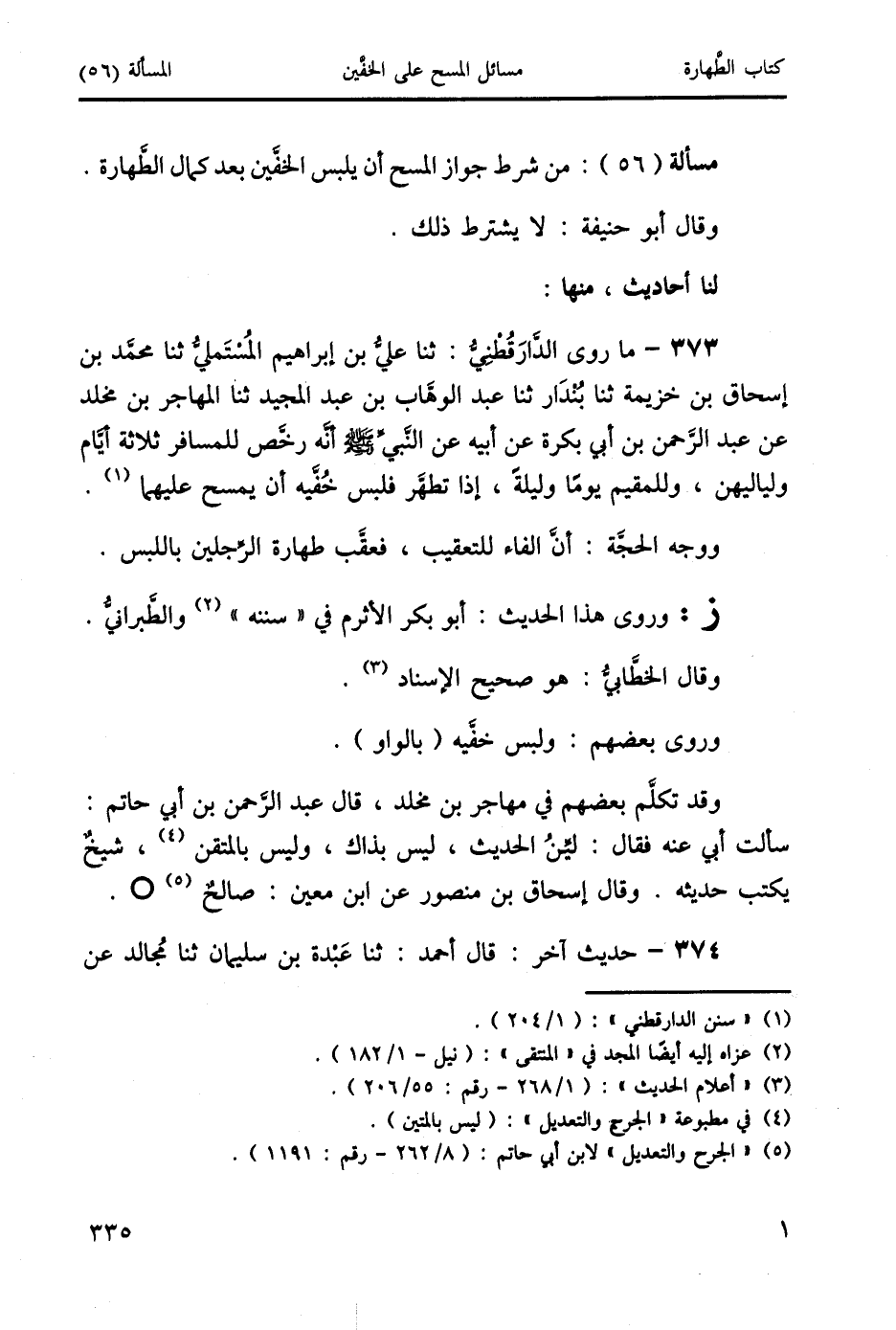 373 - ما روى الدارَقُطني: ثنا علي بن إبراهيم المُستَملي ثنا محمد بن إسحاق بن خزيمة ثنا بُندَار ثنا عبد الوهَاب بن عبد المجيد ثنا المهاجر بن مخلد عن عبد الرَحمن بن أبي بكرة عن أبيه عن النَّبيٌ صَلَّى اللَّهُ عَلَيْهِ وَسَلَّمَ أنه رخَّص للمسافر ثلاثة أيَّام ولياليهن، وللمقيم يومَا وليلةَ، إذا تطهَّر فلبس خُفَّيه أن يمسح عليهما (1).