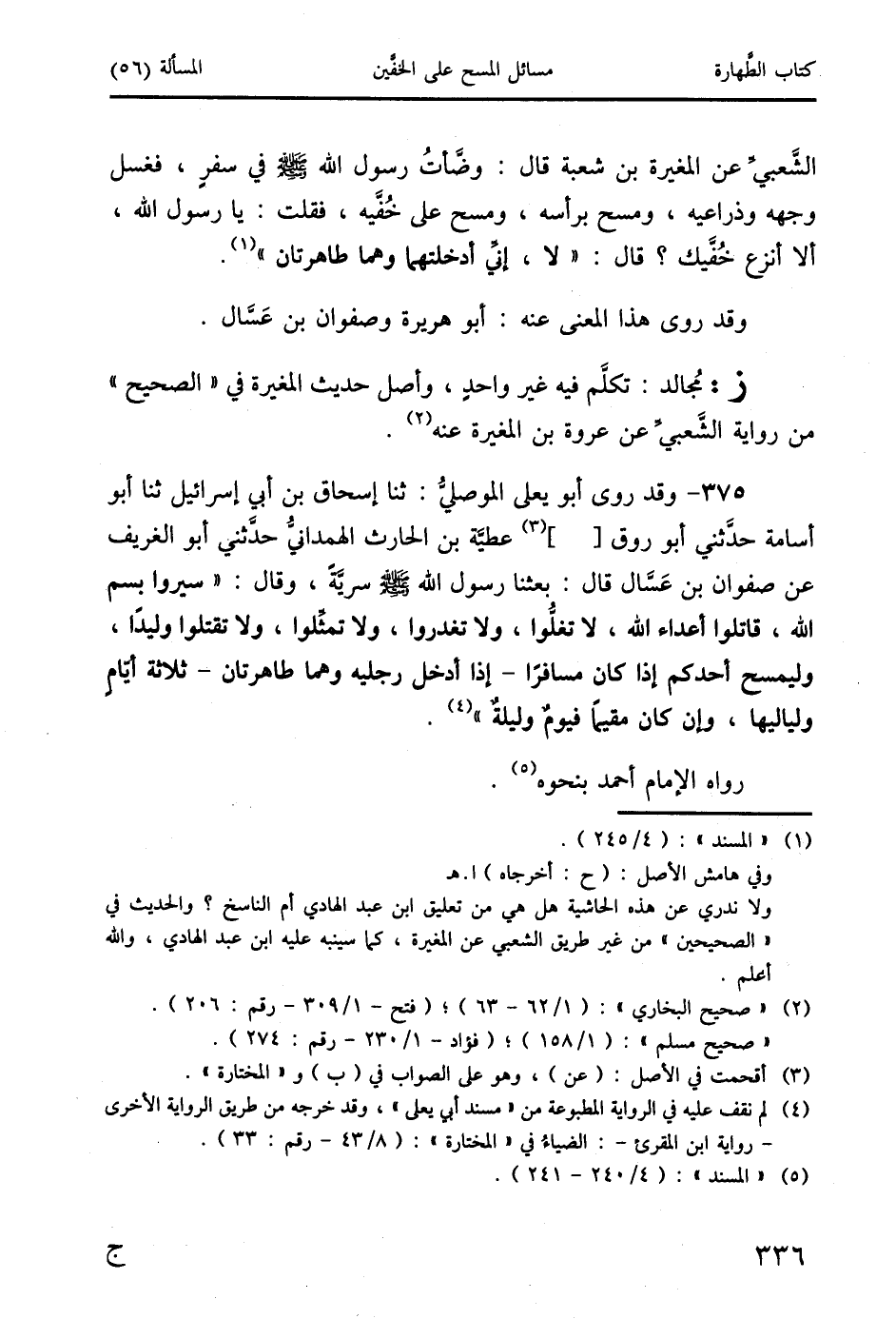 الشَعبيَّ عن المغيرة بن شعبة قال: وضأتُ رسول الله صَلَّى اللَّهُ عَلَيْهِ وَسَلَّمَ في سفرٍ، فغسل وجهه وذراعيه، ومسح برأسه، ومسح على خُفيه، فقلت: يا رسول الله، ألا أنزع خُفَيك؟ قال: " لا، إني أدخلتهما وهما طاهرتان " (1).