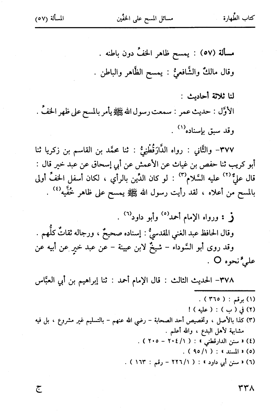 377 - والثَّاني: رواه الدَارَقُطْنِيُّ: ثنا محمَّد بن القاسم بن زكريا ثنا أبو كريب ثنا حفص بن غياث عن الأعمش عن أبي إسحاق عن عبد خير قال: قال عليٌّ (2) عليه السَّلام (3): لو كان الدَّين بالرأي، لكان أسفل الخف أولى بالمسح من أعلاه، لقد رأيت رسول الله صَلَّى اللَّهُ عَلَيْهِ وَسَلَّمَ يمسح على ظاهر خُفَّيه (4).