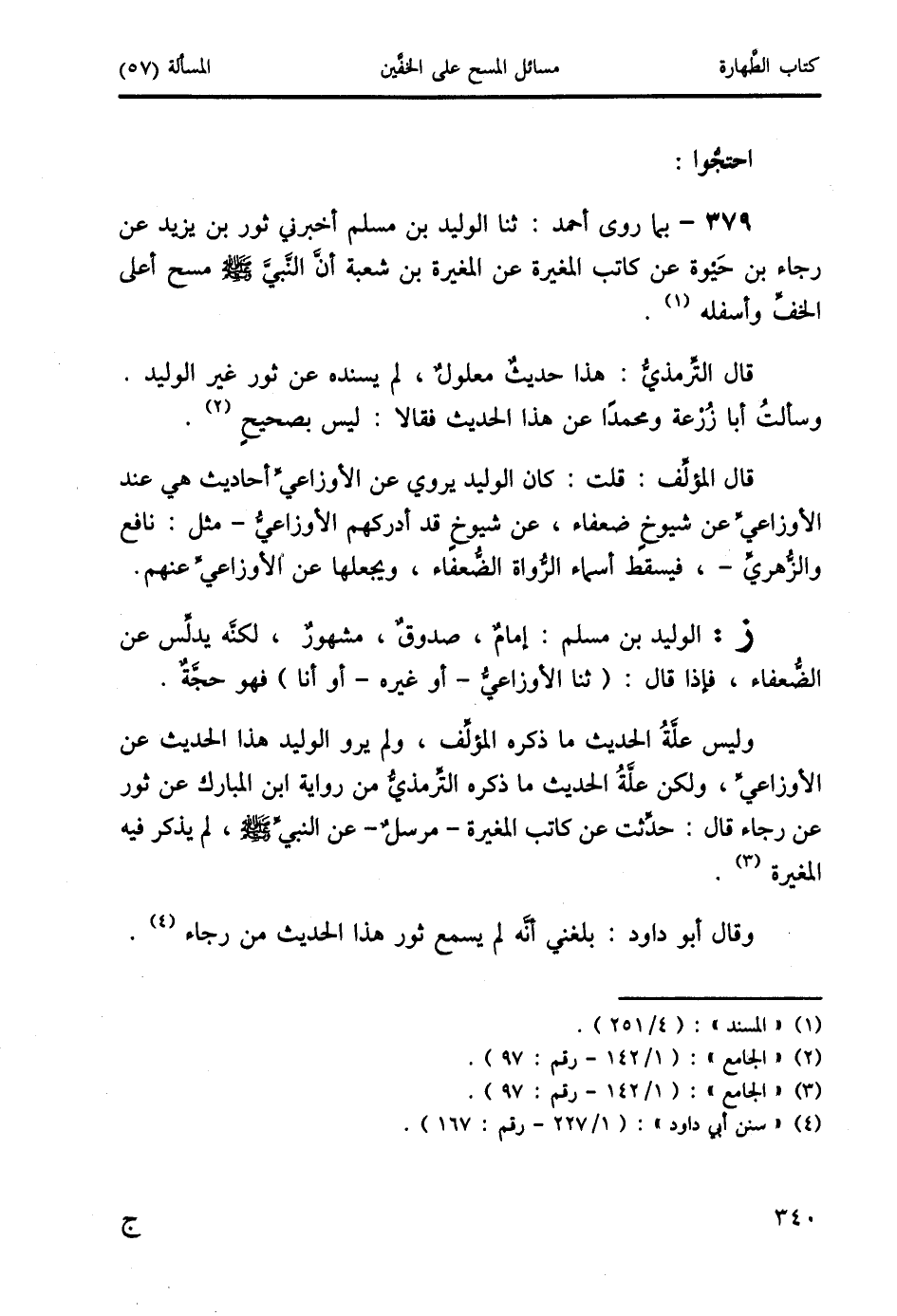 379 - بما روى أحمد: ثنا الوليد بن مسلم أخبرني ثور بن يزيد عن رجاء بن حَيوة عن كاتب المغيرة عن المغيرة بن شعبة أنَّ النَّبيَّ صَلَّى اللَّهُ عَلَيْهِ وَسَلَّمَ مسح أعلى الخفّ وأسفله (1).