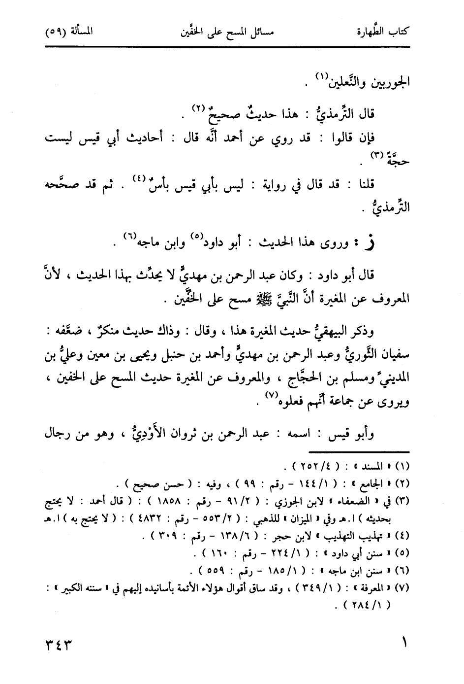 قال أبو داود: وكان عبد الرحمن بن مهديّ لا يحدِّث بهذا الحديث، لأنَ المعروف عن المغيرة أنَ النَّبيَّ صَلَّى اللَّهُ عَلَيْهِ وَسَلَّمَ مسح على الخفين.