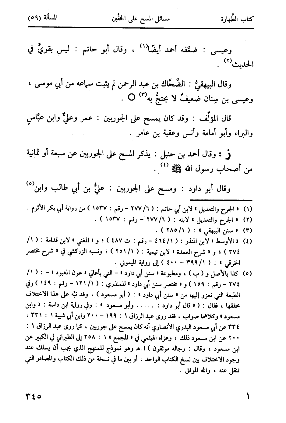 ز: وقال أحمد بن حنبل: يذكر المسح على الجوربين عن سبعة أو ثمانية من أصحاب رسول الله صَلَّى اللَّهُ عَلَيْهِ وَسَلَّمَ (4).