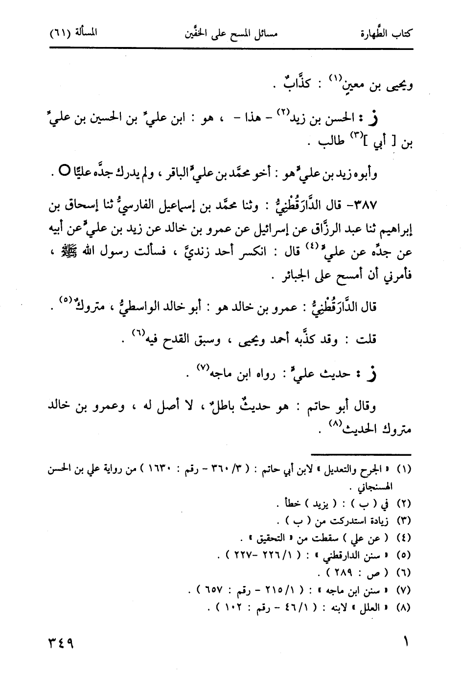 387 - قال الدَارَقُطْنيُ: وثنا محمَّد بن إسماعيل الفارسيُ ثنا إسحاق بن إبراهيم ثنا عبد الرزَاق عن إسرائيل عن عمرو بن خالد عن زيد بن علي عن أبيه عن جدِّه عن علي (4) قال: انكسر أحد زنديَّ، فسألت رسول الله صَلَّى اللَّهُ عَلَيْهِ وَسَلَّمَ، فأمرني أن أمسح على الجبائر.