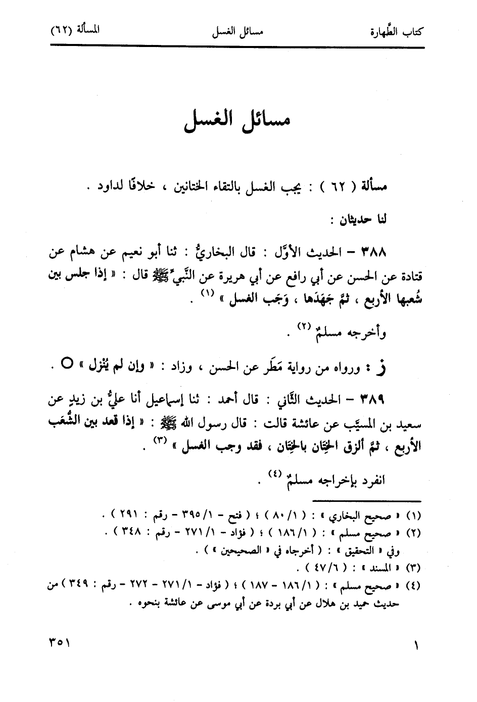388 - الحديث الأوَل: قال البخاريُّ: ثنا أبو نعيم عن هشام عن قتادة عن الحسن عن أبي رافع عن أبي هريرة عن النَبيِّ صَلَّى اللَّهُ عَلَيْهِ وَسَلَّمَ قال: " إذا جلس بين شُعبها الأربع، ثم جَهَدها، وَجَب الغسل " (1).