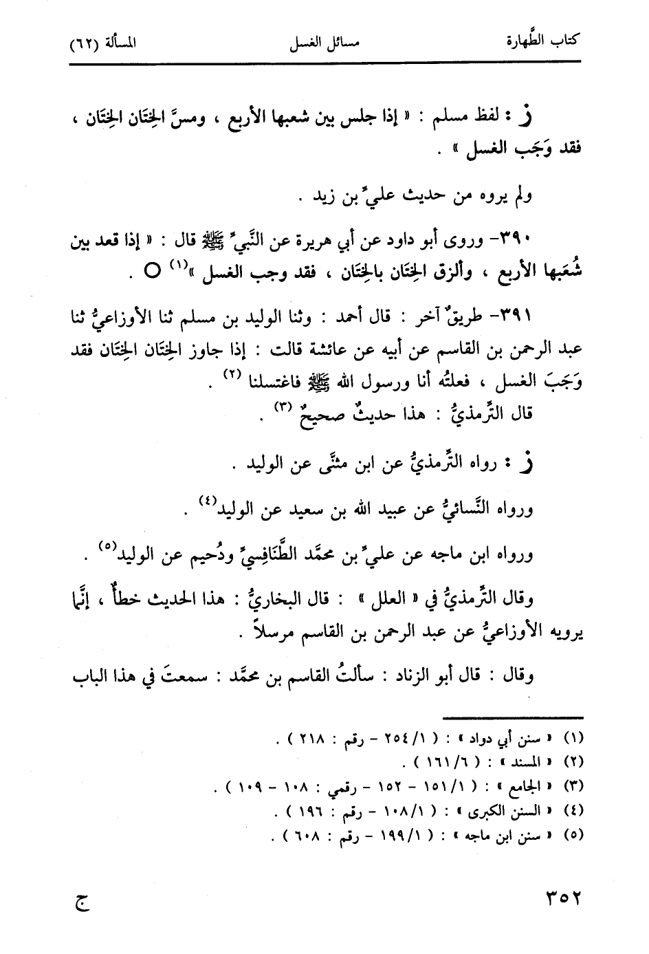 390 - وروى أبو داود عن أبي هريرة عن النَبيِّ صَلَّى اللَّهُ عَلَيْهِ وَسَلَّمَ قال: " إذا قعد بين شُعَبها الأربع، وألزق الخِتَان بالخِتَان، فقد وجب الغسل " (1) O.