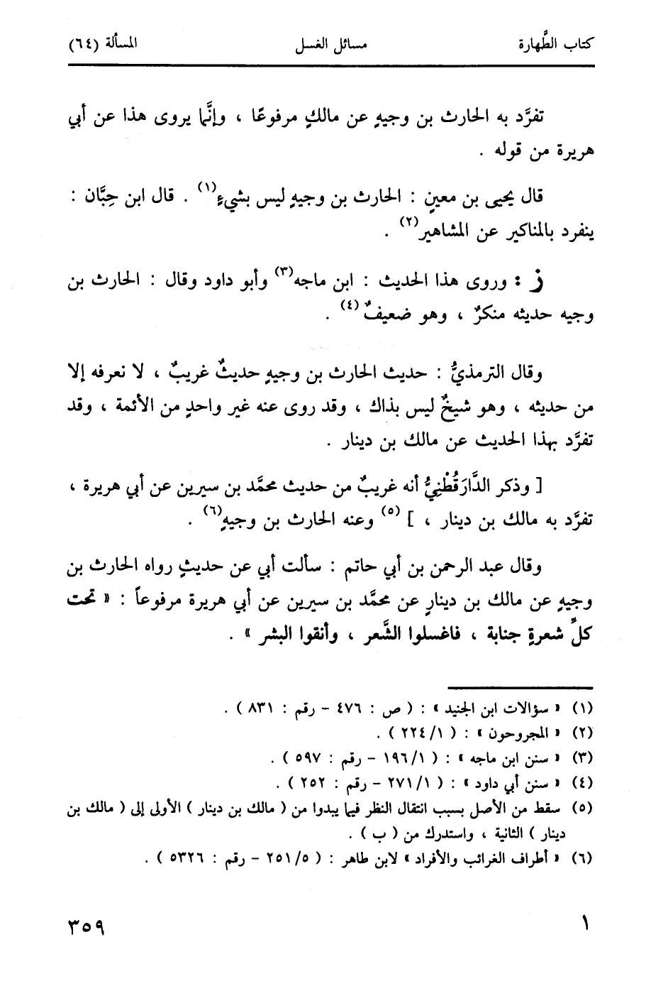 وقال عبد الرحمن بن أبي حاتم: سألت أبي عن حديثِ رواه الحارث بن وجيهِ عن مالك بن دينارِ عن محمَّد بن سيرين عن أبي هريرة مرفوعاَ: " تحت كل شعرةٍ جنابة، فاغسلوا الشَّعر، وأنقوا البشر ".