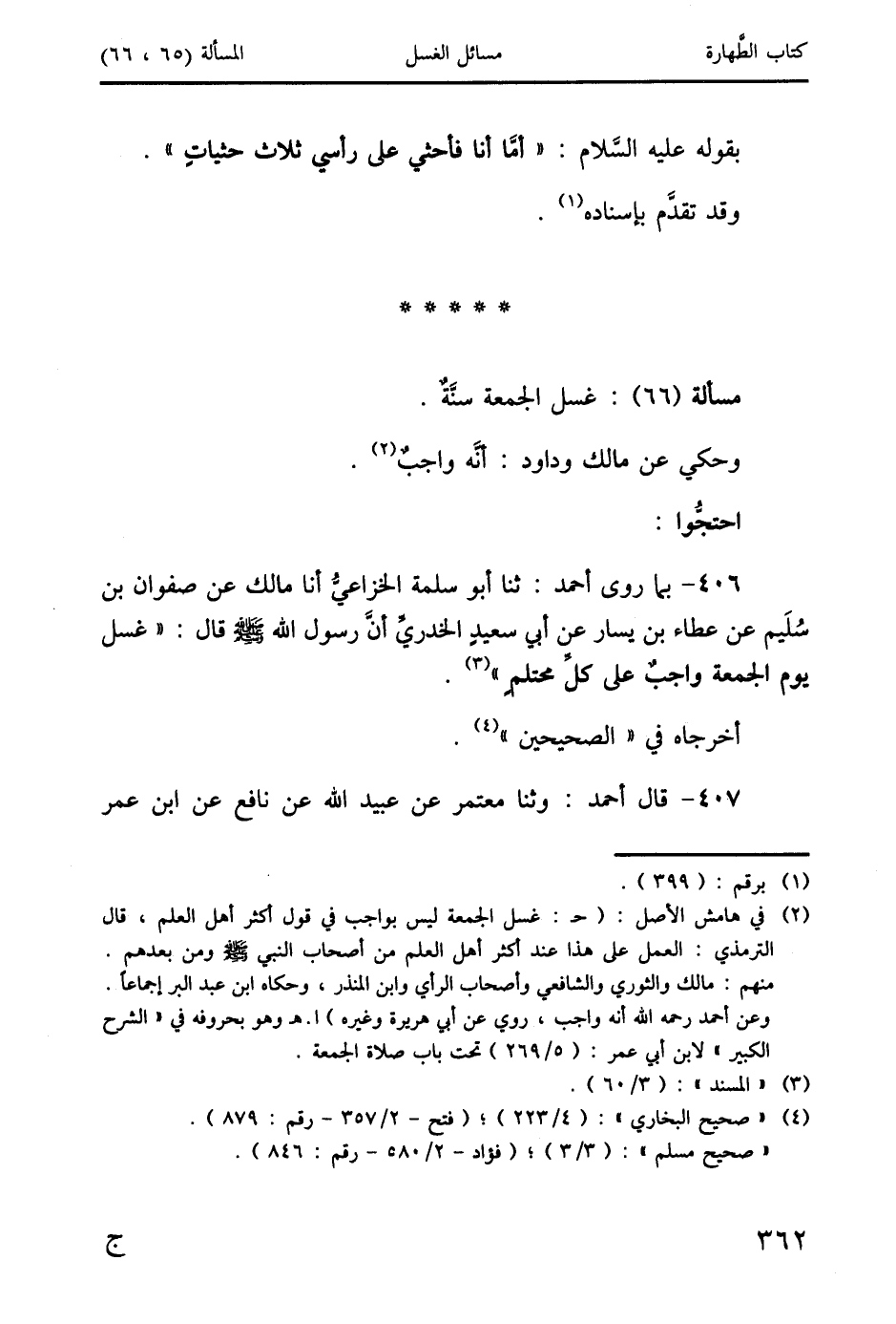 406 - بما روى أحمد: ثنا أبو سلمة الخزاعيُ أنا مالك عن صفوان بن سُلَيم عن عطاء بن يسار عن أبي سعيدِ الخدري أنَ رسول الله صَلَّى اللَّهُ عَلَيْهِ وَسَلَّمَ قال: " غسل يوم الجمعة واجبٌ على كلَّ محتلمٍ " (3).