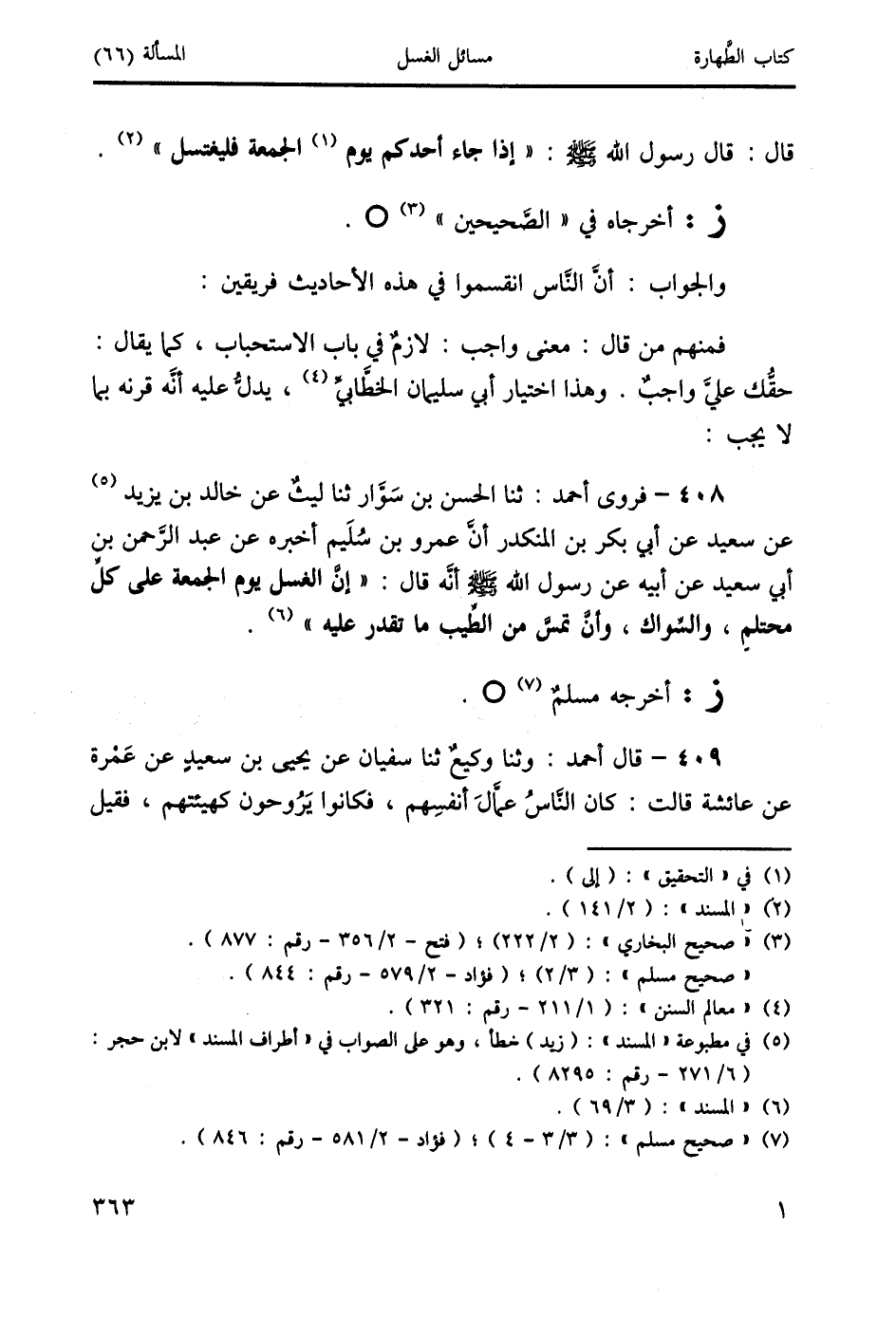 408 - فروى أحمد: ثنا الحسن بن سَوَّار ثنا ليث عن خالد بن يزيد (5) عن سعيد عن أبي بكر بن المنكدر أن عمرو بن سُلَيم أخبره عن عبد الرَحمن بن أبي سعيد عن أبيه عن رسول الله صَلَّى اللَّهُ عَلَيْهِ وَسَلَّمَ أنَه قال: " إنَّ الغسل يوم الجمعة على كل محتلمٍ، والسِّواك، وأن تمسَّ من الطَّيب ما تقدر عليه " (6).