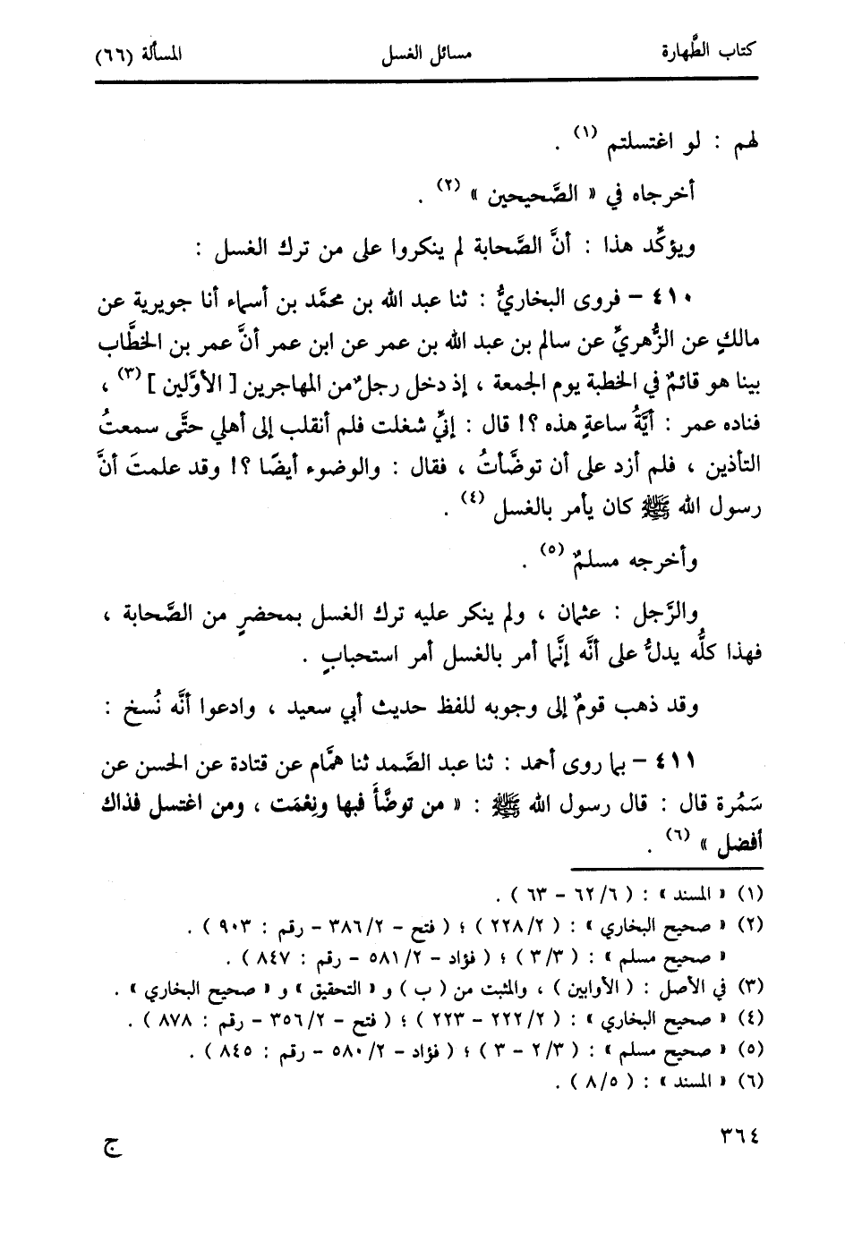 410 - فروى البخاريُّ: ثنا عبد الله بن محمد بن أسماء أنا جويرية عن مالكٍ عن الزهري عن سالم بن عبد الله بن عمر عن ابن عمر أنَّ عمر بن الخطَاب بينا هو قائم في الخطبة يوم الجمعة، إذ دخل رجلٌ من المهاجرين [الأوَّلين] (3)، فناده عمر: أيَّهُ ساعةٍ هذه؟! قال: إني شغلت فلم أنقلب إلى أهلي حتَّى سمعتُ التأذين، فلم أزد على أن توضَّأتُ، فقال: والوضوء أيضاً؟! وقد علمتَ أن رسول الله صَلَّى اللَّهُ عَلَيْهِ وَسَلَّمَ كان يأمر بالغسل (4).