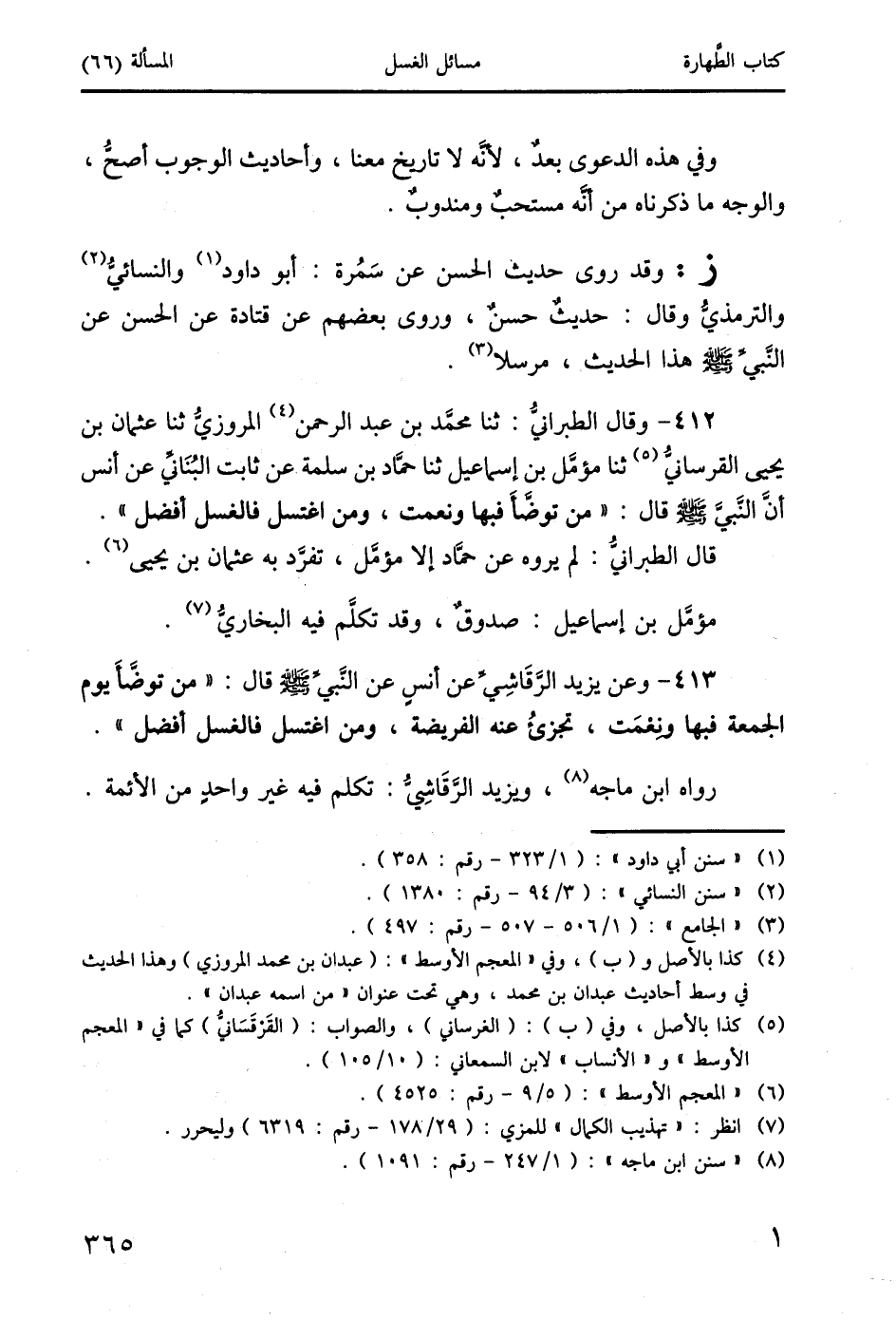 412 - وقال الطبرانيُ: ثنا محمَّد بن عبد الرحمن (4) المروزيُّ ثنا عثمان بن يحيى القرسانيُ (5) ثنا مؤمَل بن إسماعيل ثنا حمَّاد بن سلمة عن ثابت البُنَاني عن أنس أنَّ النَّبيَّ صَلَّى اللَّهُ عَلَيْهِ وَسَلَّمَ قال: " من توضَّأَ فبها ونعمت، ومن اغتسل فالغسل أفضل ".