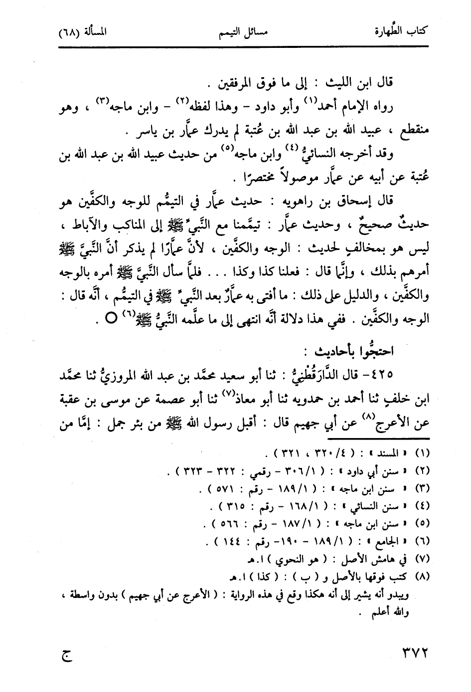 425 - قال الدَارَقُطنيُ: ثنا أبو سعيد محمَّد بن عبد الله المروزيَّ ثنا محمَّد ابن خلفٍ ثنا أحمد بن حمدويه ثنا أبو معاذ (7) ثنا أبو عصمة عن موسى بن عقبة عن الأعرج (8) عن أبي جهيم قال: أقبل رسول الله صَلَّى اللَّهُ عَلَيْهِ وَسَلَّمَ من بئر جمل: إمَا من