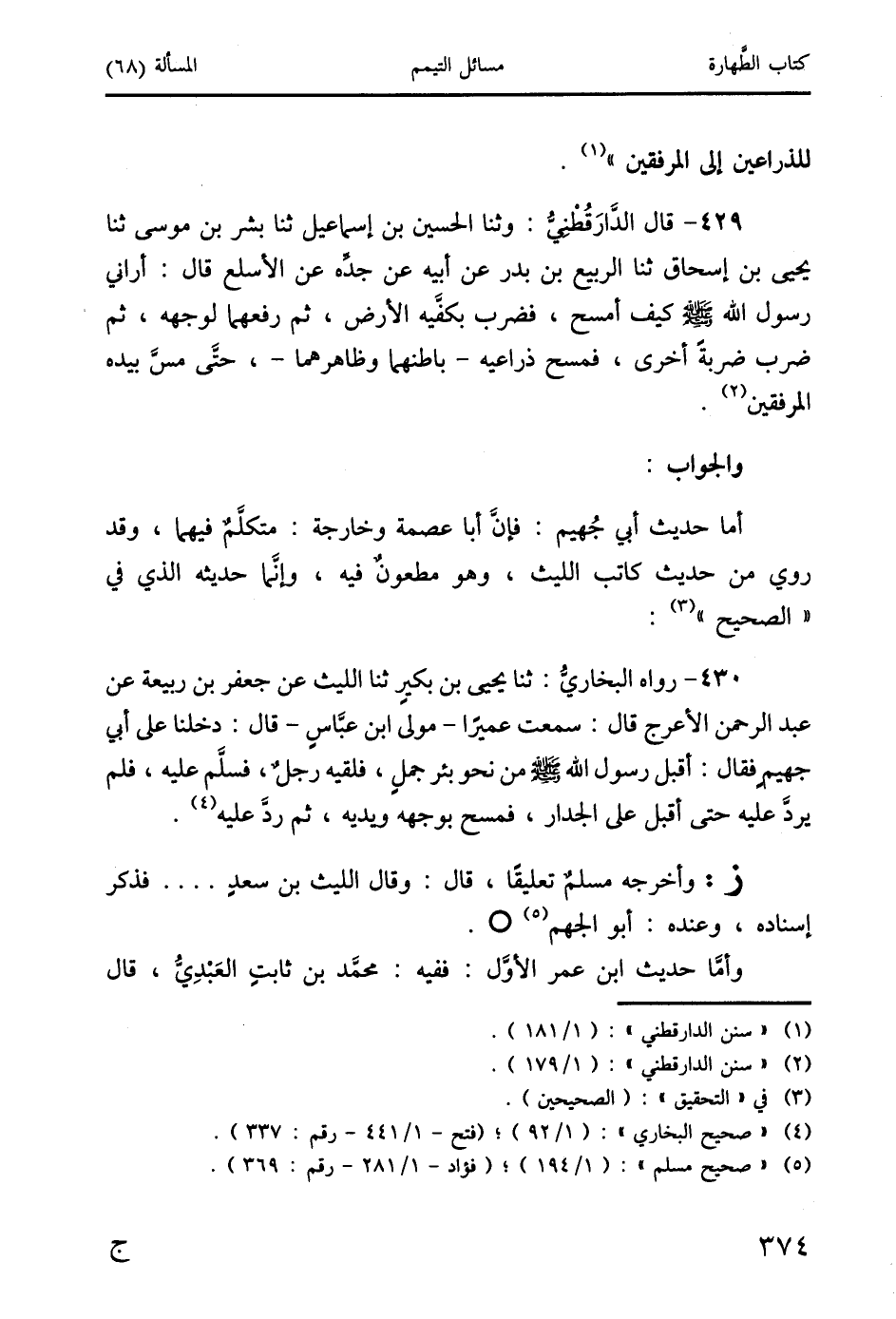 430 - رواه البخاريَّ: ثنا يحيى بن بكيٍر ثنا الليث عن جعفر بن ربيعة عن عبد الرحمن الأعرج قال: سمعت عميراً- مول ابن عبَاسِ- قال: دخلنا على أبي جهيم فقال: أقبل رسول الله صَلَّى اللَّهُ عَلَيْهِ وَسَلَّمَ من نحو بئر جملِ، فلقيه رجلٌ، فسلَم عليه، فلم يردَّ عليه حتى أقبل على الجدار، فمسح بوجهه ويديه، ثم ردَّ عليه (4).