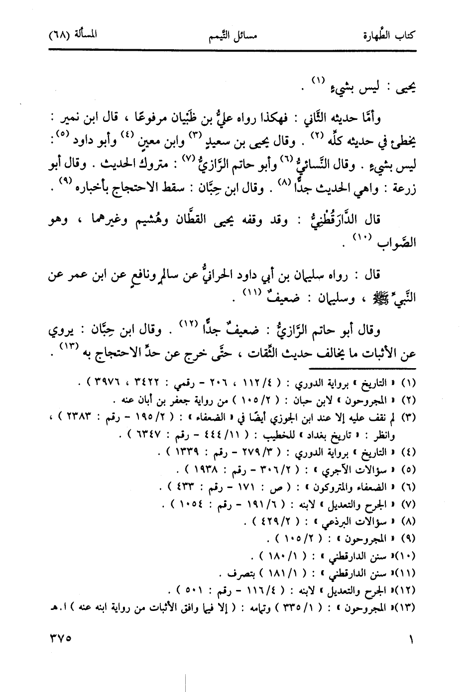 وأمَّا حديثه الثَاني: فهكذا رواه علي بن ظَبيان مرفوعاً، قال ابن نمير: يخطئ في حديثه كله (2). وقال يحيى بن سعيدِ (3) وابن معيِن (4) وأبو داود (5): ليس بشيءٍ. وقال النَسائيُّ (6) وأبو حاتم الرازيَّ (7): متروك الحديث. وقال أبو زرعة: واهي الحديث جداً (8). وقال ابن حِبَان: سقط الاحتجاج بأخباره (9).