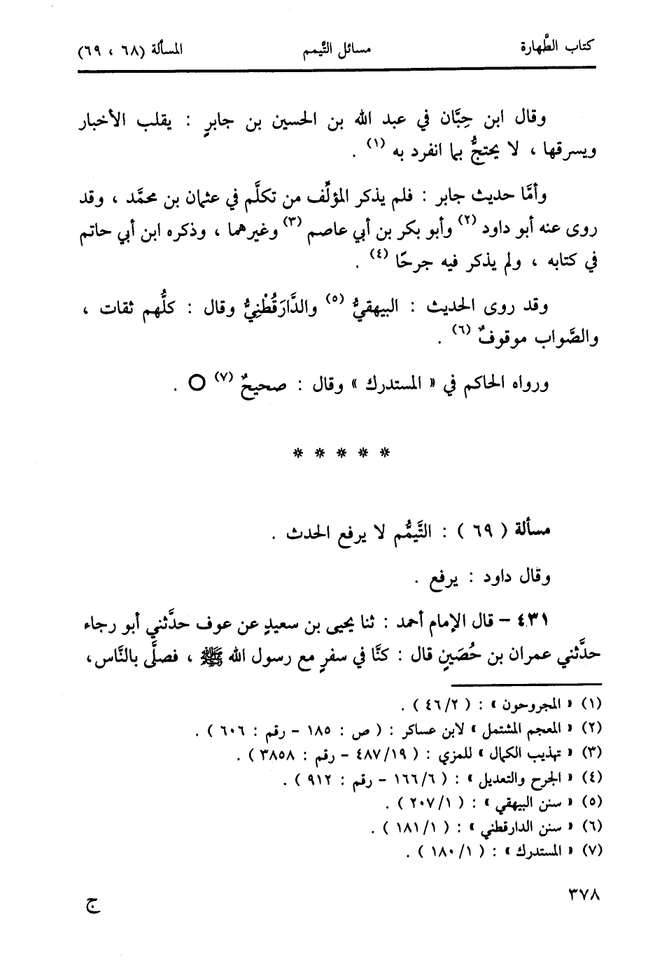 وأمَّا حديث جابر: فلم يذكر المؤلف من تكلُّم في عثمان بن محمَّد، وقد روى عنه أبو داود (2) وأبو بكر بن أبي عاصم (3) وغيرهما، وذكره ابن أبي حاتم في كتابه، ولم يذكر فيه جرحاً (4).