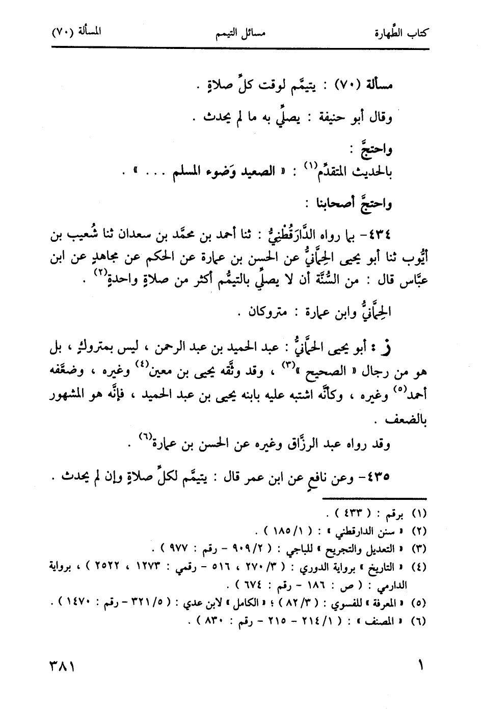 434 - بما رواه الدَارَقُطنيُ: ثنا أحمد بن محمَّد بن سعدان ثنا شُعيب بن أيُّوب ثنا أبو يحيى الحِمانيُ عن الحسن بن عمارة عن الحكم عن مجاهدِ عن ابن عبَّاس قال: من السُنَّة أن لا يصلي بالتيمُم أكثر من صلاةٍ واحدةٍ (2).