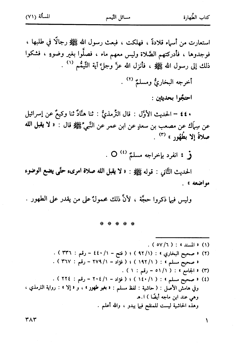 440 - الحديث الأوَل: قال الترمذيَّ: ثنا هنَّاد ثنا وكيعٌ عن إسرائيل عن سِماَك عن مصعب بن سعدِ عن ابن عمر عن النَّبي صَلَّى اللَّهُ عَلَيْهِ وَسَلَّمَ قال: " لا يقبل الله صلاةً إلا بطُهُور " (3).