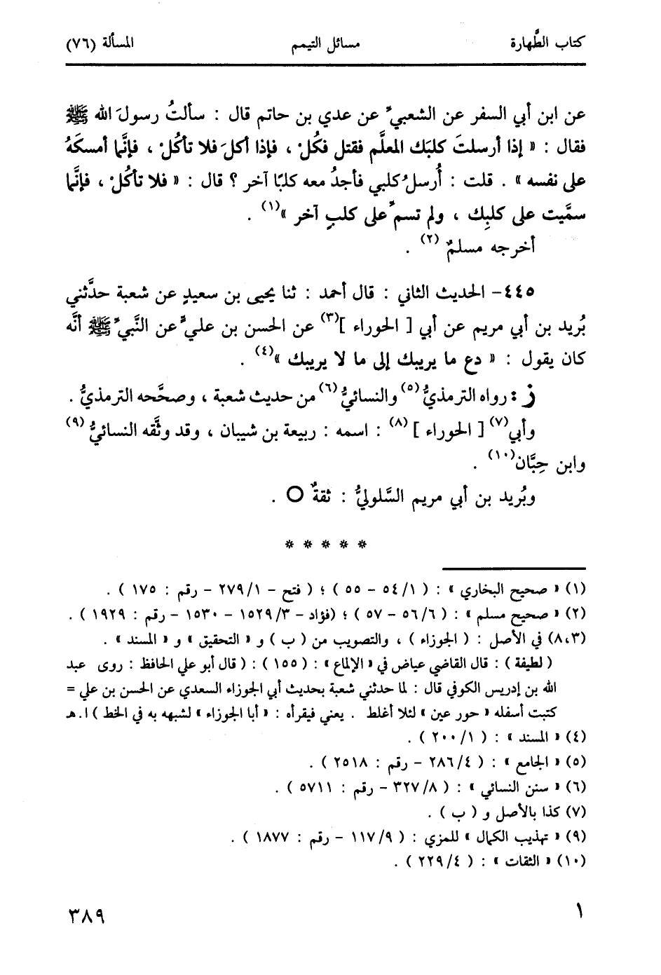 عن ابن أبي السفر عن الشعبيَّ عن عدي بن حاتم قال: سألتُ رسولَ الله صَلَّى اللَّهُ عَلَيْهِ وَسَلَّمَ فقال: " إذا أرسلتَ كلبَك المعلَّم فقتل فكُل، فإذا أكلَ فلا تأكُل، فإنَما أمسكَهُ على نفسه ". قلت: أُرسلُ كلبي فأجدُ معه كلباً آخر؟ قال: " فلا تأكُل، فإنَّما سمَّيت على كلبِك، ولم تسمَّ على كلبٍ آخر " (1).