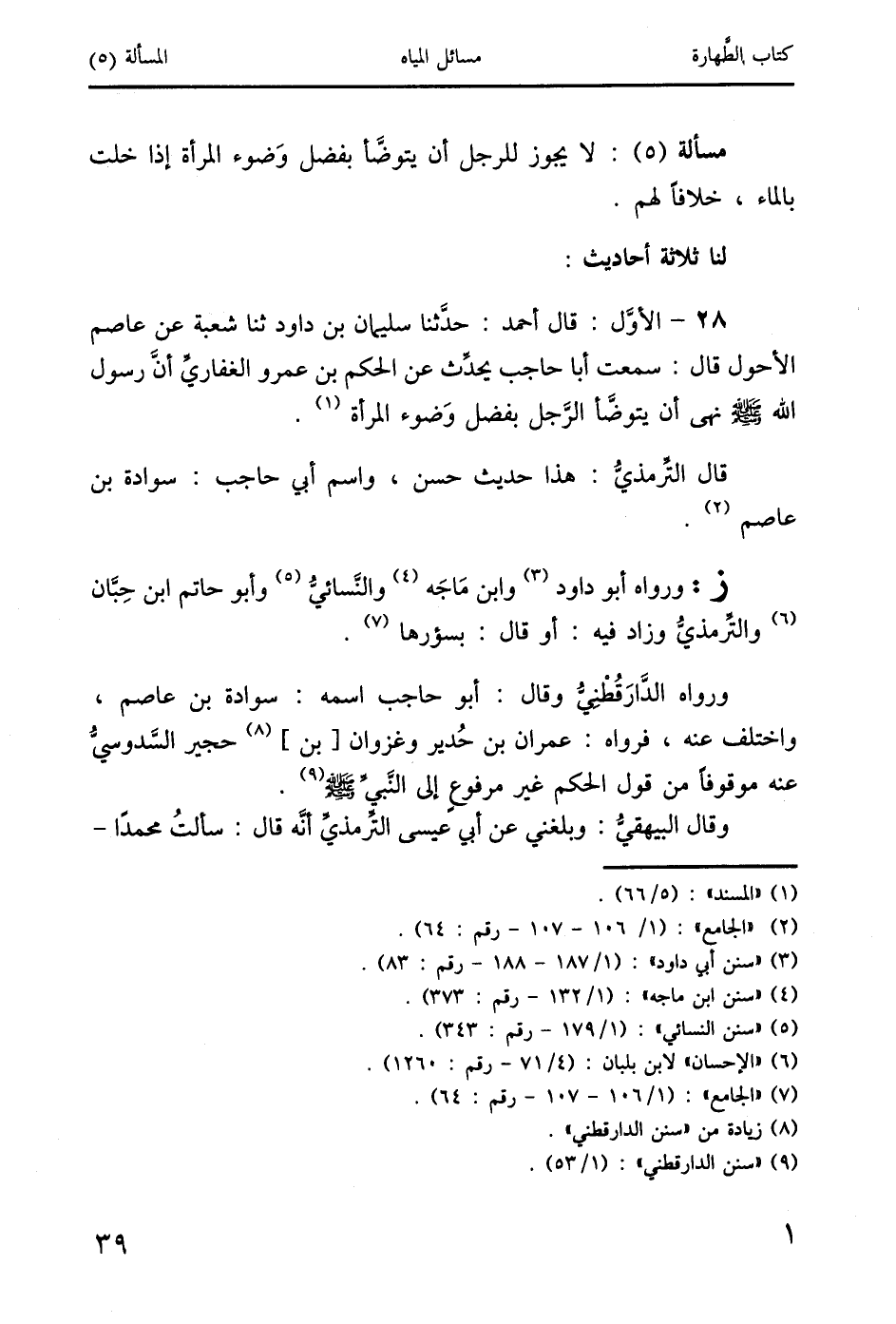 28 - الأوَّل: قال أحمد: حدَّثنا سليمان بن داود ثنا شعبة عن عاصم الأحول قال: سمعت أبا حاجب يحدِّث عن الحكم بن عمرو الغفاريِّ أنَّ رسول الله صَلَّى اللَّهُ عَلَيْهِ وَسَلَّمَ نهى أن يتوضَّأ الرَّجل بفضل وَضوء المرأة (1).