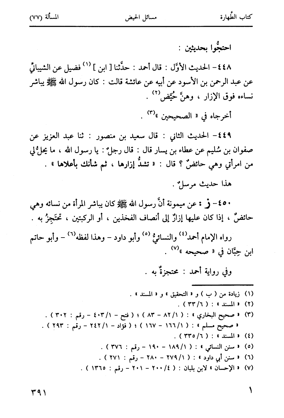 450 - ز: عن ميمونة أنَ رسول الله صَلَّى اللَّهُ عَلَيْهِ وَسَلَّمَ كان يباشر المرأة من نسائه وهي حائضٌ، إذا كان عليها إزار إلى أنصاف الفخذين، أو الركبتين، تحتَجِزُ به.
