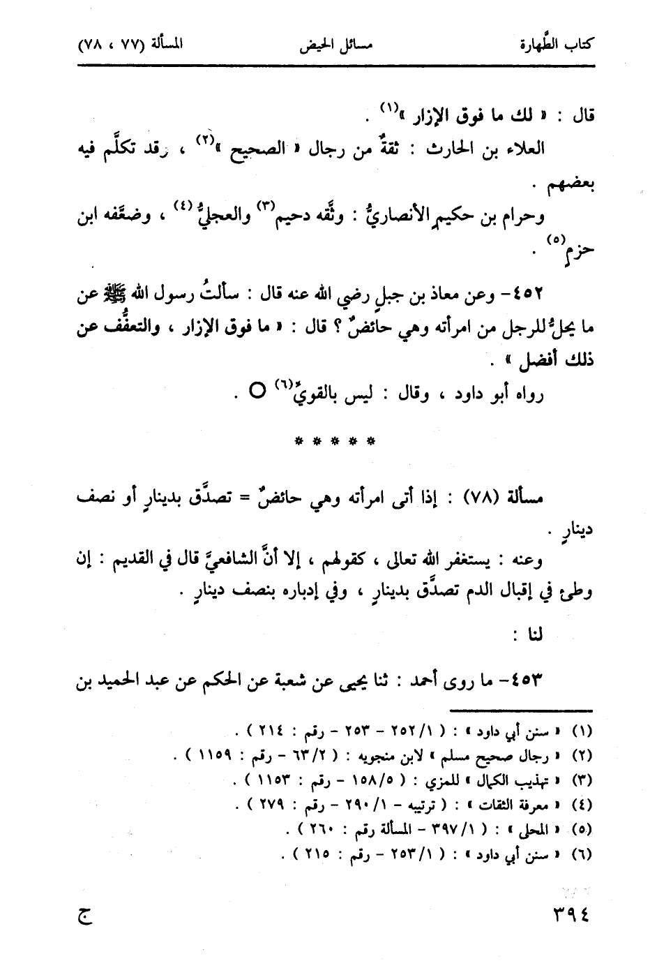 452 - وعن معاذ بن جبلٍ رضي الله عنه قال: سألتُ رسول الله صَلَّى اللَّهُ عَلَيْهِ وَسَلَّمَ عن ما يحلُ للرجل من امرأته وهي حائضٌ؟ قال: " ما فوق الإزار، والتعفُّف عن ذلك أفضل ".