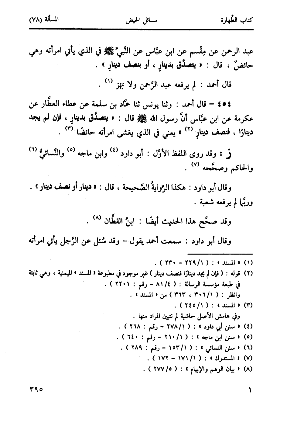454 - قال أحمد: وثنا يونس ثنا حمَّاد بن سلمة عن عطاء العطَّار عن عكرمة عن ابن عبَّاس أن رسول الله صَلَّى اللَّهُ عَلَيْهِ وَسَلَّمَ قال: " يتصدَّق بدينار، فإن لم يجد ديناراً، فنصف دينارٍ (2) " يعني في الذي يغشى امرأته حائضاً (3).