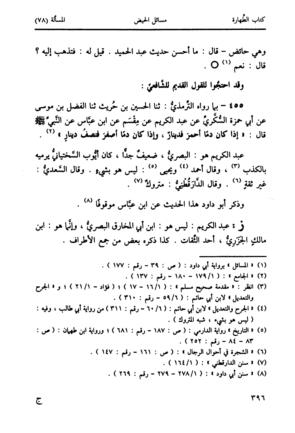 455 - بما رواه التِّرمذي: ثنا الحسين بن حُريث ثنا الفضل بن موسى عن أبي حمزة السكَريٌ عن عبد الكريم عن مِقسَم عن ابن عبَّاس عن النبيٌ صَلَّى اللَّهُ عَلَيْهِ وَسَلَّمَ قال: " إذا كان دماً أحمرَ فدينارٌ، وإذا كان دماً أصفرَ فنصفُ دينارٍ " (2).