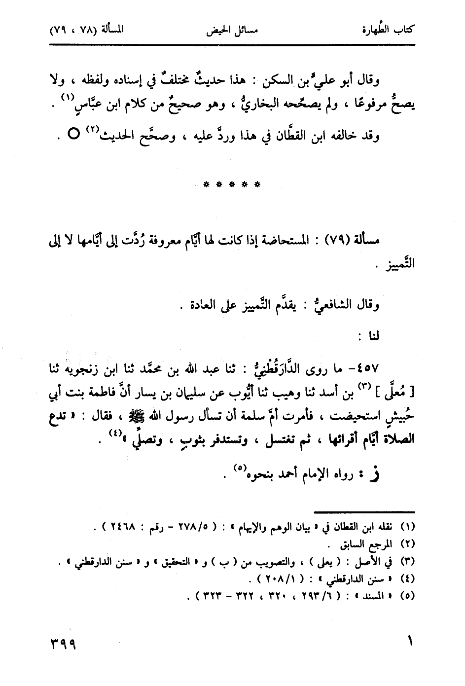 457 - ما روى الدَارَقُطْنيُ: ثنا عبد الله بن محمَّد ثنا ابن زنجويه ثنا [مُعلى] (3) بن أسد ثنا وهيب ثنا أيُّوب عن سليمان بن يسار أنَ فاطمة بنت أبي حُبيشِ استحيضت، فأمرت أمَ سلمة أن تسأل رسول الله صَلَّى اللَّهُ عَلَيْهِ وَسَلَّمَ، فقال: " تدع الصلاة أيَّام أقرائها، ثم تغتسل، وتستدفر بثوب، وتصلي " (4).