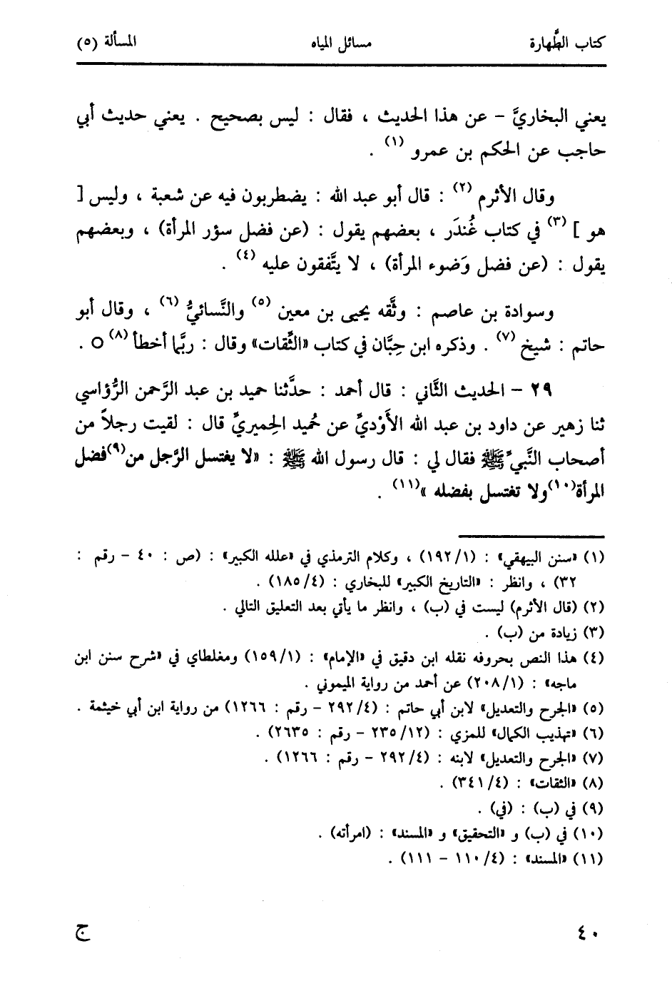 29 - الحديث الثَّاني: قال أحمد: حدَّثنا حميد بن عبد الرَّحمن الرُّؤاسي ثنا زهير عن داود بن عبد الله الأَوديِّ عن حُميد الحِميريِّ قال: لقيت رجلاً من أصحاب النَّبيِّ صَلَّى اللَّهُ عَلَيْهِ وَسَلَّمَ فقال لي: قال رسول الله صَلَّى اللَّهُ عَلَيْهِ وَسَلَّمَ: "لا يغتسل الرَّجل من (9) فضل المرأة (10) ولا تغتسل بفضله" (11).