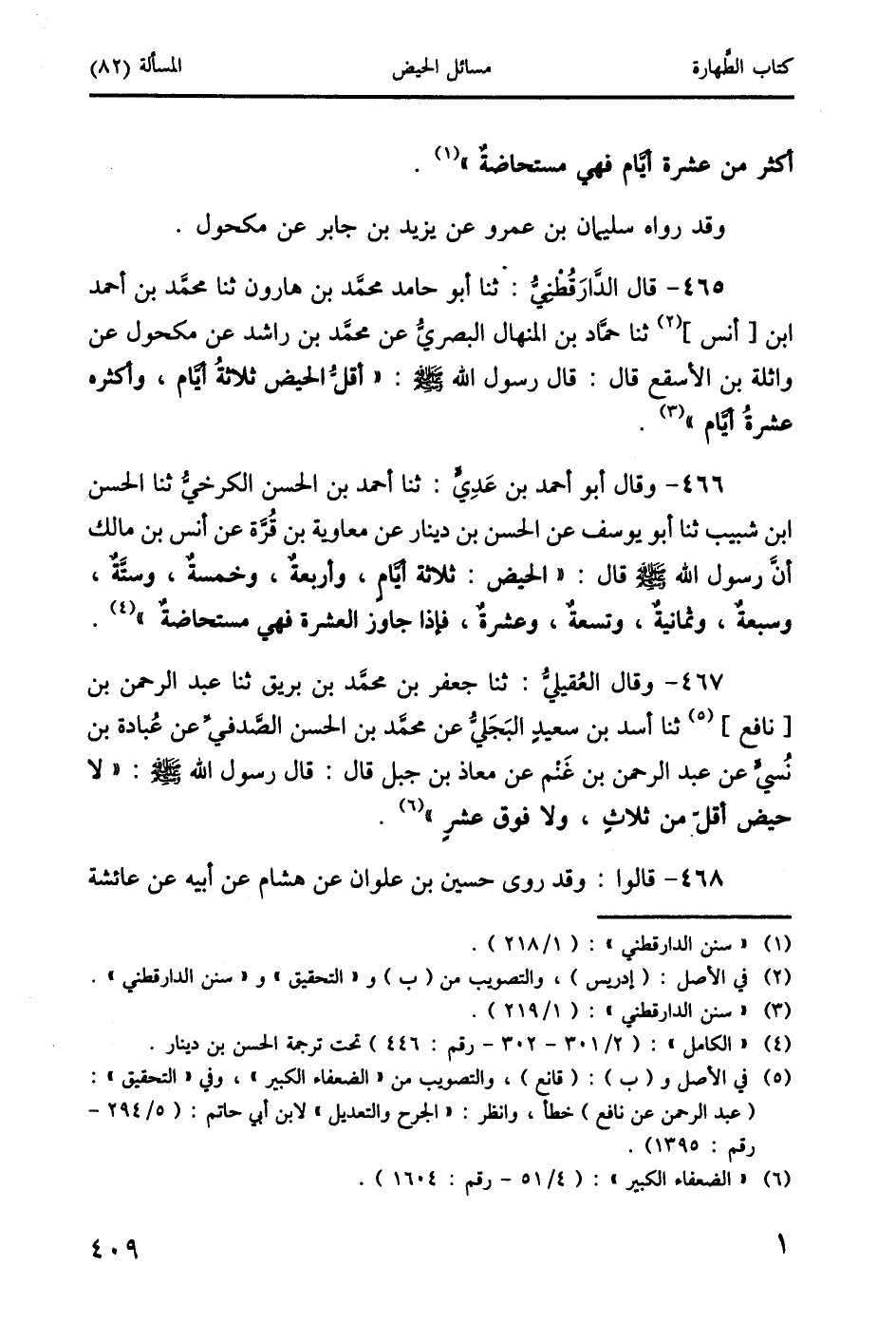 465 - قال الدَارَقُطْنيُ: ثنا أبو حامد محمَّد بن هارون ثنا محمَّد بن أحمد ابن [أنس] (2) ثنا حمَّاد بن المنهال البصريَّ عن محمَّد بن راشد عن مكحول عن واثلة بن الأسقع قال: قال رسول الله صَلَّى اللَّهُ عَلَيْهِ وَسَلَّمَ: " أقلُّ الحيض ثلاثةُ أيَّام، وأكثره عشرة أيَّام " (3).