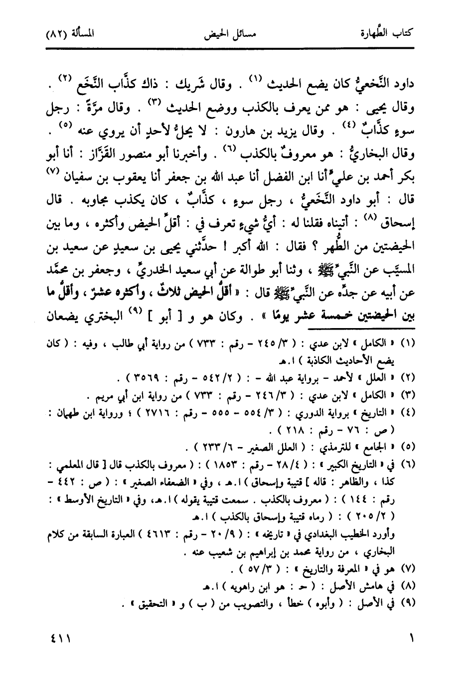 وقال البخاري: هو معروفٌ بالكذب (6). وأخبرنا أبو منصور القَزَّاز: أنا أبو بكر أحمد بن علي أنا ابن الفضل أنا عبد الله بن جعفر أنا يعقوب بن سفيان (7) قال: أبو داود النَّخَعي، رجل سوءَ، كذاب، كان يكذب مجاوبه. قال إسحاق (8): أتيناه فقلنا له: أي شيءَ تعرف في: أقلِّ الحيض وأكثره، وما بين الحيضتين من الطهر؟ فقال: الله أكبر! حدَثني يحيى بن سعيدِ عن سعيد بن المسيَّب عن النَّبي صَلَّى اللَّهُ عَلَيْهِ وَسَلَّمَ، وثنا أبو طوالة عن أبي سعيد الخدريِّ، وجعفر بن محمد عن أبيه عن جدِّه عن النَّبيّ صَلَّى اللَّهُ عَلَيْهِ وَسَلَّمَ قال: " أقل الحيض ثلاثٌ، وأكثره عشرٌ، وأقل ما بين الحيضتين خمسة عشر يومًا ". وكان هو و [أبو] (9) البختري يضعان