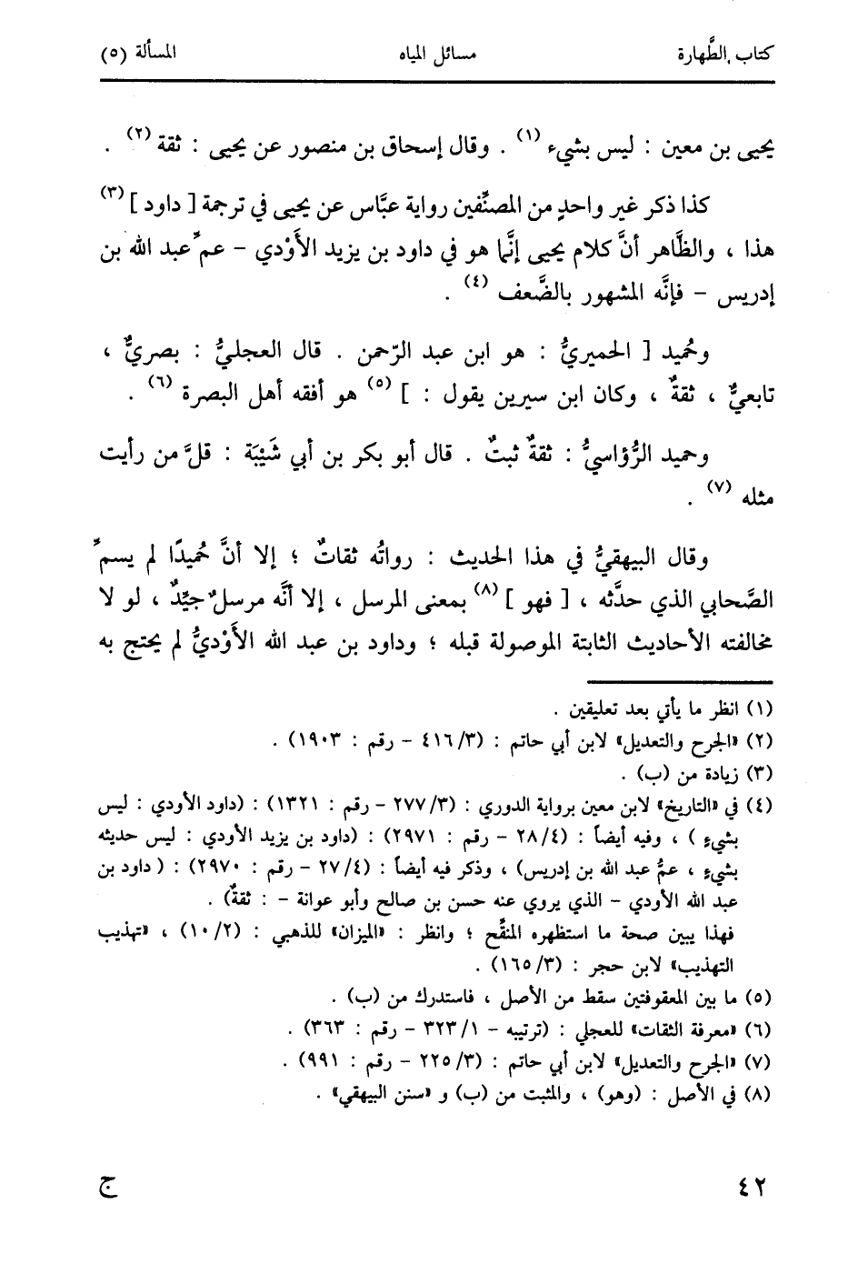 (4) في "التاريخ" لابن معين برواية الدوري: (3/ 277 - رقم: 1321): (داود الأودي: ليس بشيءٍ)، وفيه أيضاً: (4/ 28 - رقم: 2971): (داود بن يزيد الأودي: ليس حديثه بشيء، عمُّ عبد الله بن إدريس)، وذكر فيه أيضاً: (4/ 27 - رقم: 2970): (داود بن عبد الله الأودي- الذي يروي عنه حسن بن صالح وأبو عوانة-: ثقةٌ).فهذا يبين صحة ما استظهره المنقِّح؛ وانظر: "الميزان" للذهبي: (2/ 10)، "تهذيب التهذيب" لابن حجر: (3/ 165).
