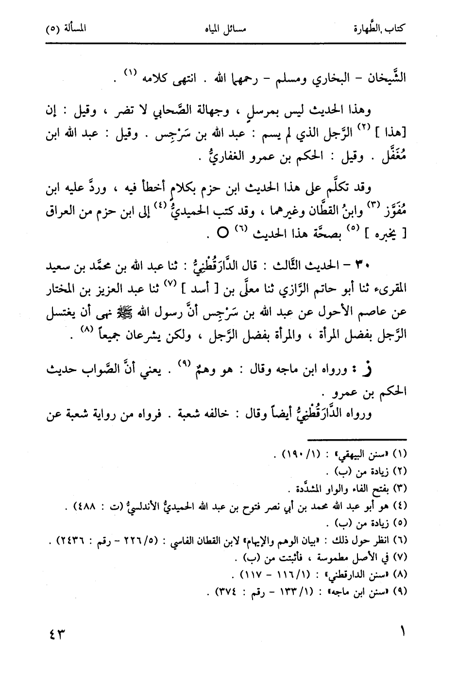 30 - الحديث الثَّالث: قال الدَّارَقُطْنِيُّ: ثنا عبد الله بن محمَّد بن سعيد المقرئ ثنا أبو حاتم الرَّازي ثنا معلَّى بن [أسد] (7) ثنا عبد العزيز بن المختار عن عاصم الأحول عن عبد الله بن سَرْجِس أنَّ رسول الله صَلَّى اللَّهُ عَلَيْهِ وَسَلَّمَ نهى أن يغتسل الرَّجل بفضل المرأة، والمرأة بفضل الرَّجل، ولكن يشرعان جميعاً (8).