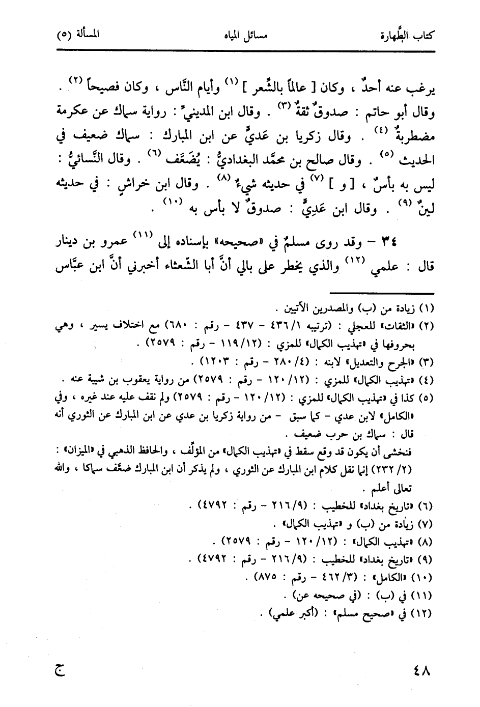 (5) كذا في "تهذيب الكمال" للمزي: (12/ 120 - رقم: 2579) ولم نقف عليه عند غيره، وفي "الكامل" لابن عدي- كما سبق- من رواية زكريا بن عدي عن ابن المبارك عن الثوري أنه قال: سماك بن حرب ضعيف.