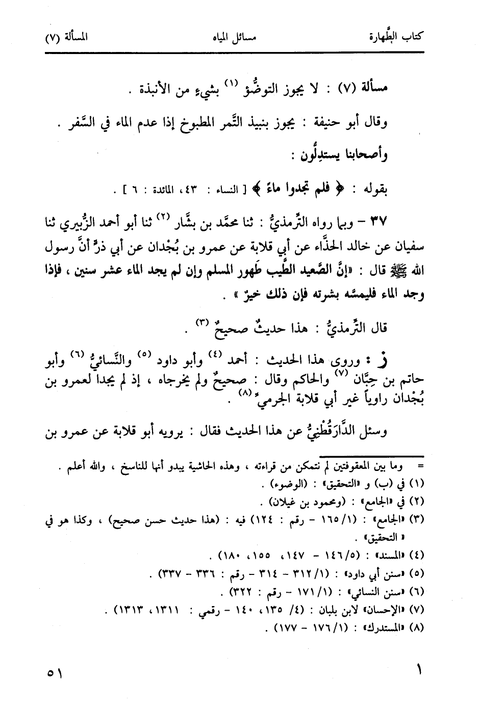 37 - وبما رواه التِّرمذيُّ: ثنا محمَّد بن بشَّار (2) ثنا أبو أحمد الزُّبيري ثنا سفيان عن خالد الحذَّاء عن أبي قلابة عن عمرو بن بُجْدان عن أبي ذرٍّ أنَّ رسول الله صَلَّى اللَّهُ عَلَيْهِ وَسَلَّمَ قال: "إنَّ الصَّعيد الطَّيب طَهور المسلم وإن لم يجد الماء عشر سنين، فإذا وجد الماء فليمسَّه بشرته فإن ذلك خيرٌ".