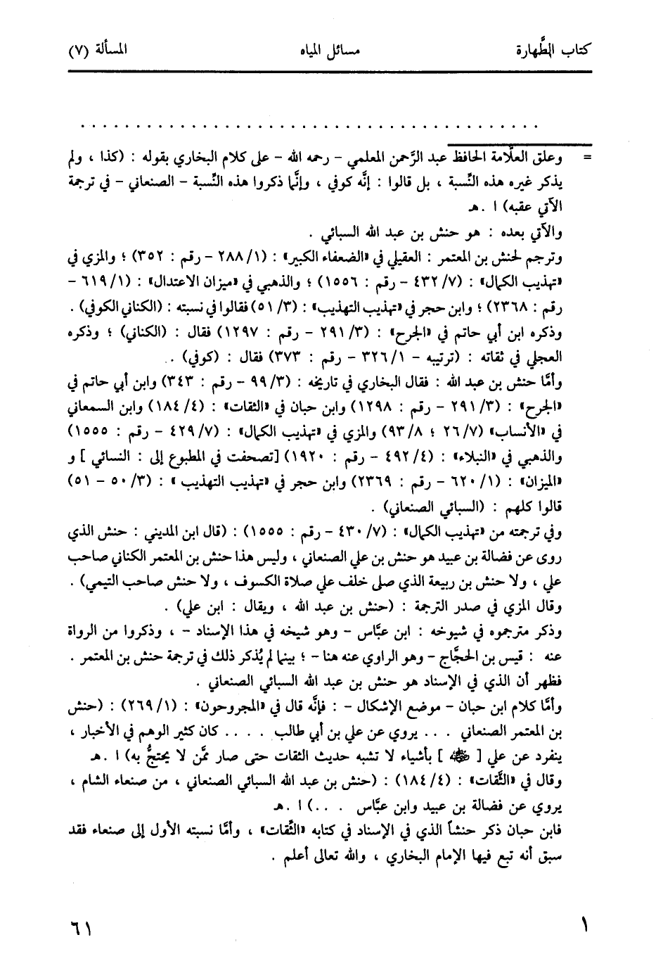 = وعلق العلامة الحافظ عبد الرَّحمن المعلمي- رحمه الله- على كلام البخاري بقوله: (كذا، ولم يذكر غيره هذه النسبة، بل قالوا: إنَّه كوفي، وإنَّما ذكروا هذه النِّسبة - الصنعاني- في ترجمة الآتي عقبه) ا. هـ