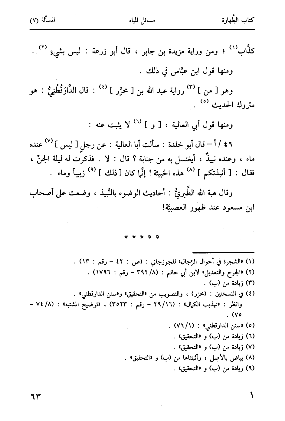 46/أ- قال أبو خلدة: سألت أبا العالية: عن رجلٍ [ليس] (7) عنده ماء، وعنده نبيذٌ، أيغتسل به من جنابة؟ قال: لا. فذكرت له ليلة الجنِّ، فقال: [أنبذتكم] (8) هذه الخبيثة! إنَّما كان [ذلك] (9) زبيباً وماء.